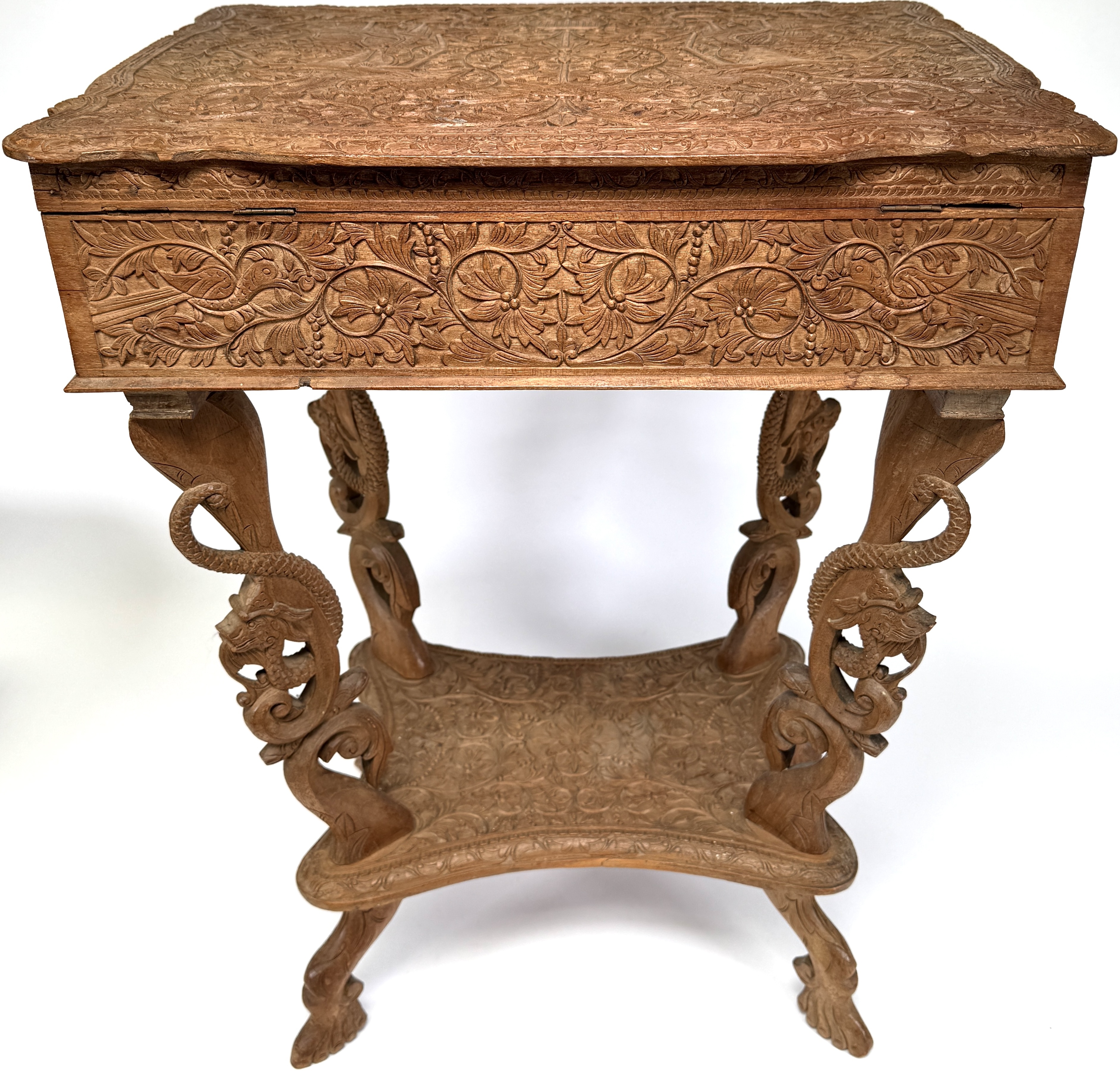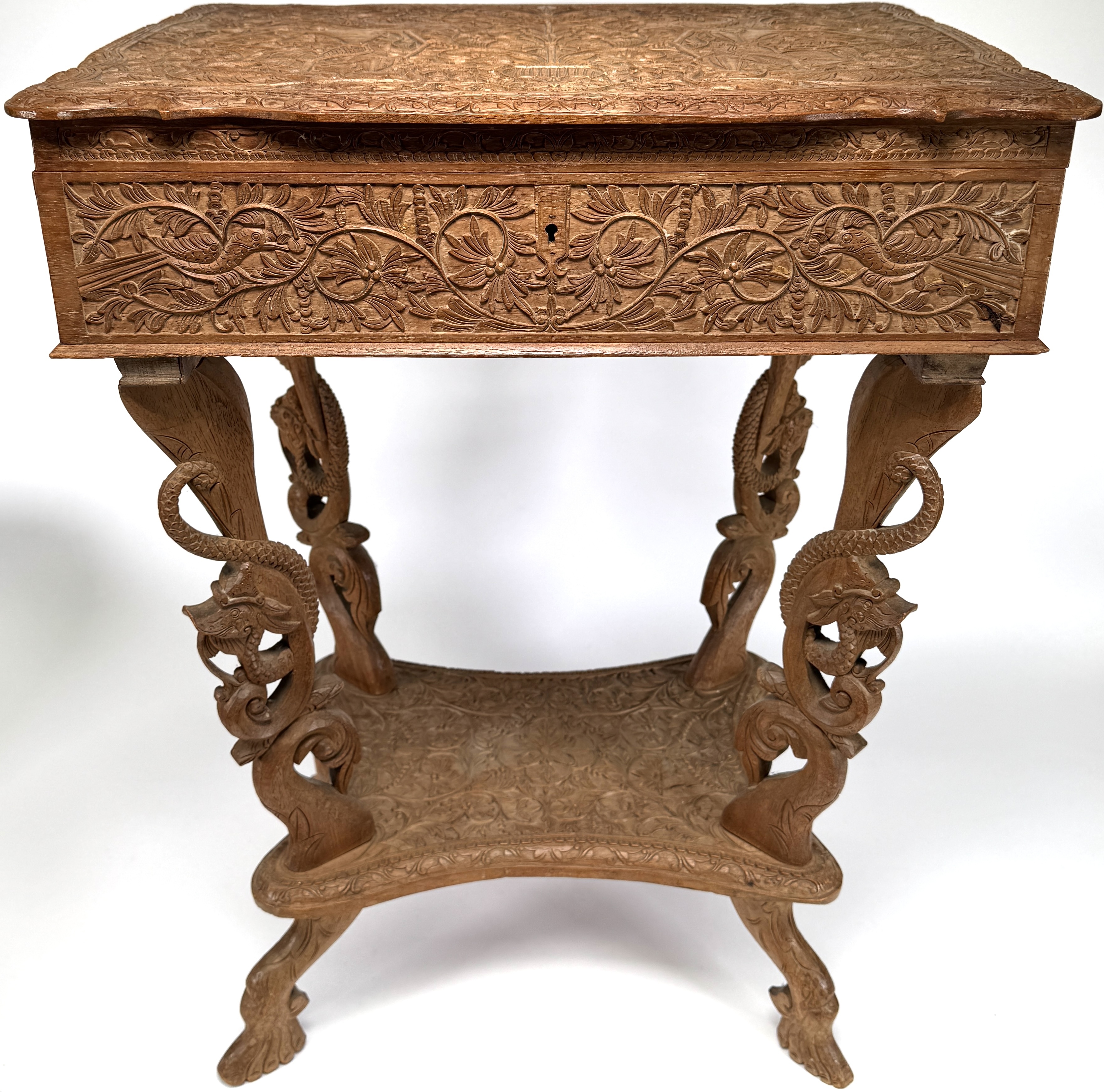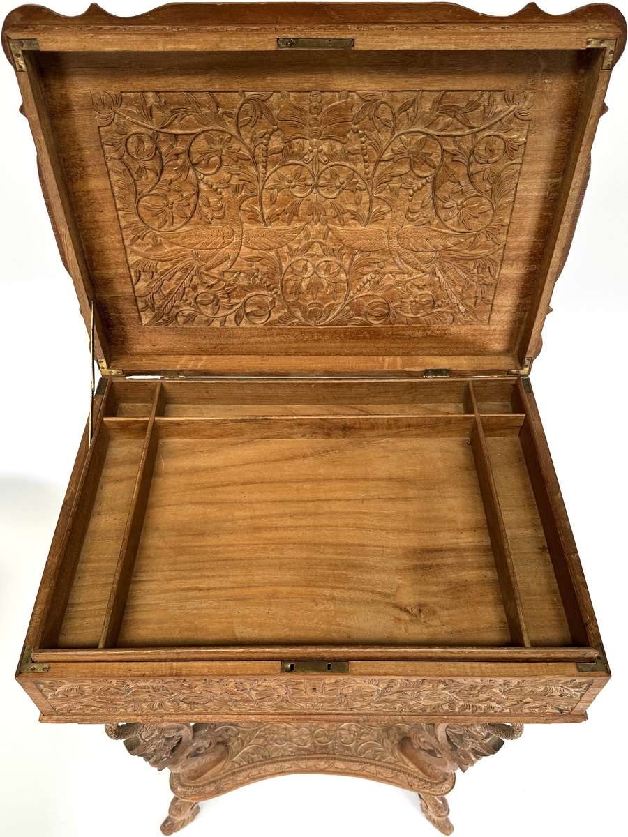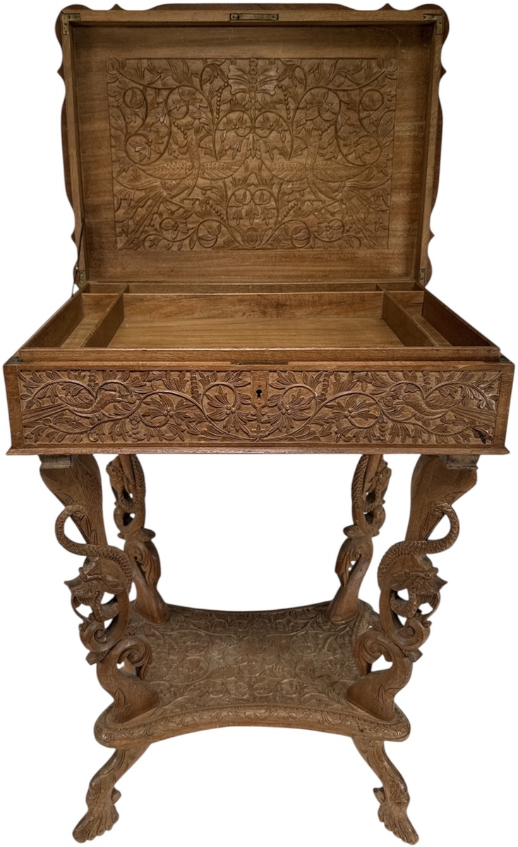 Houten naaitafel met opklapbaar blad, eerste helft 20e eeuw, uitgevoerd in koloniale stijl met Oosterse invloeden. Het meubel is vervaardigd uit gesneden hardhout en rijkelijk versierd met florale motieven, vogels en mythische dieren in diep reliëf. Kenmerkend zijn de opengewerkte poten met drakenkoppen, het gesneden blad met symmetrische decoraties en het afsluitbare binnenvak met uitgesneden paneel. Zeker zijn van deelname? Plaats een schriftelijk bod online! |