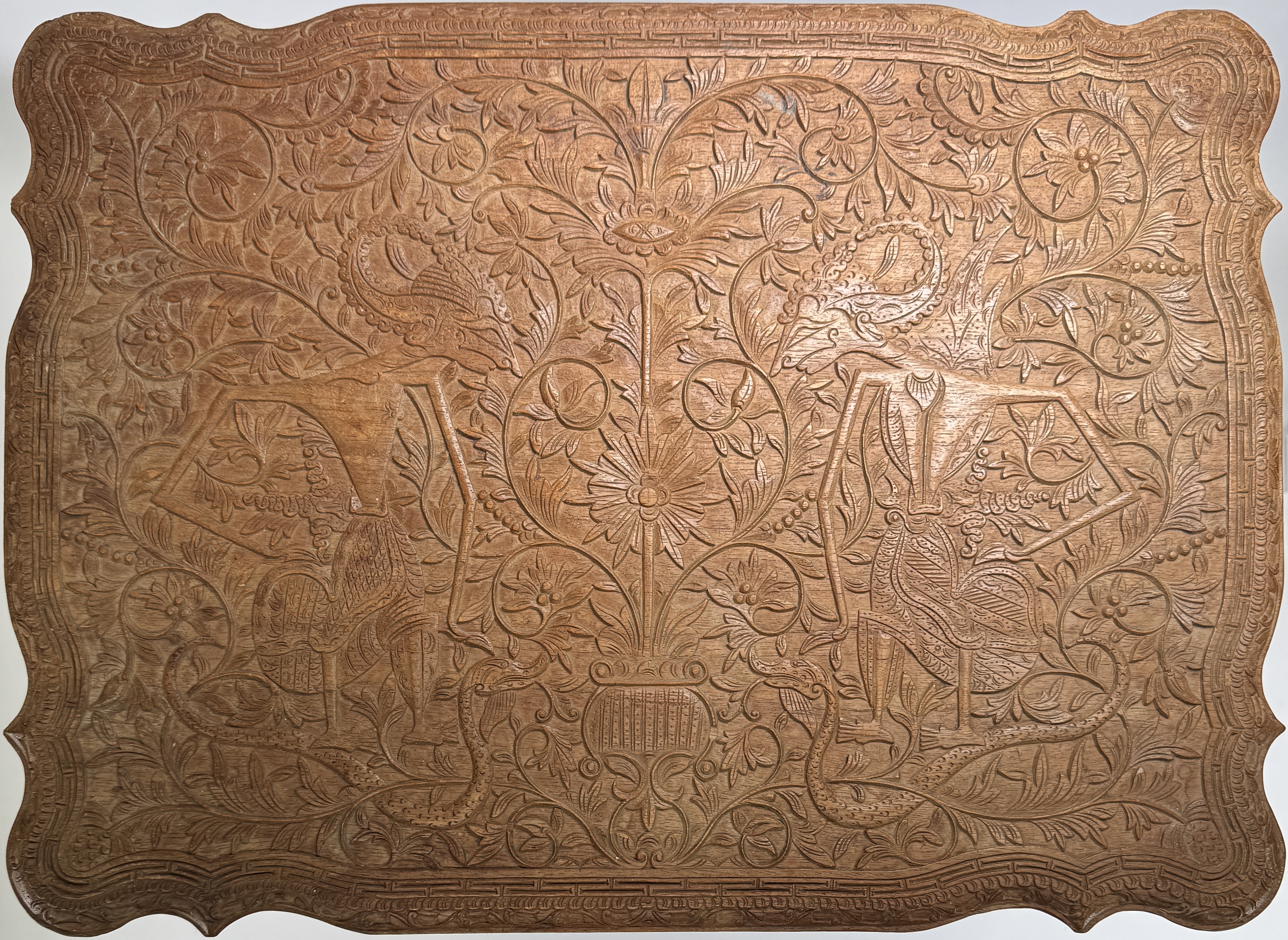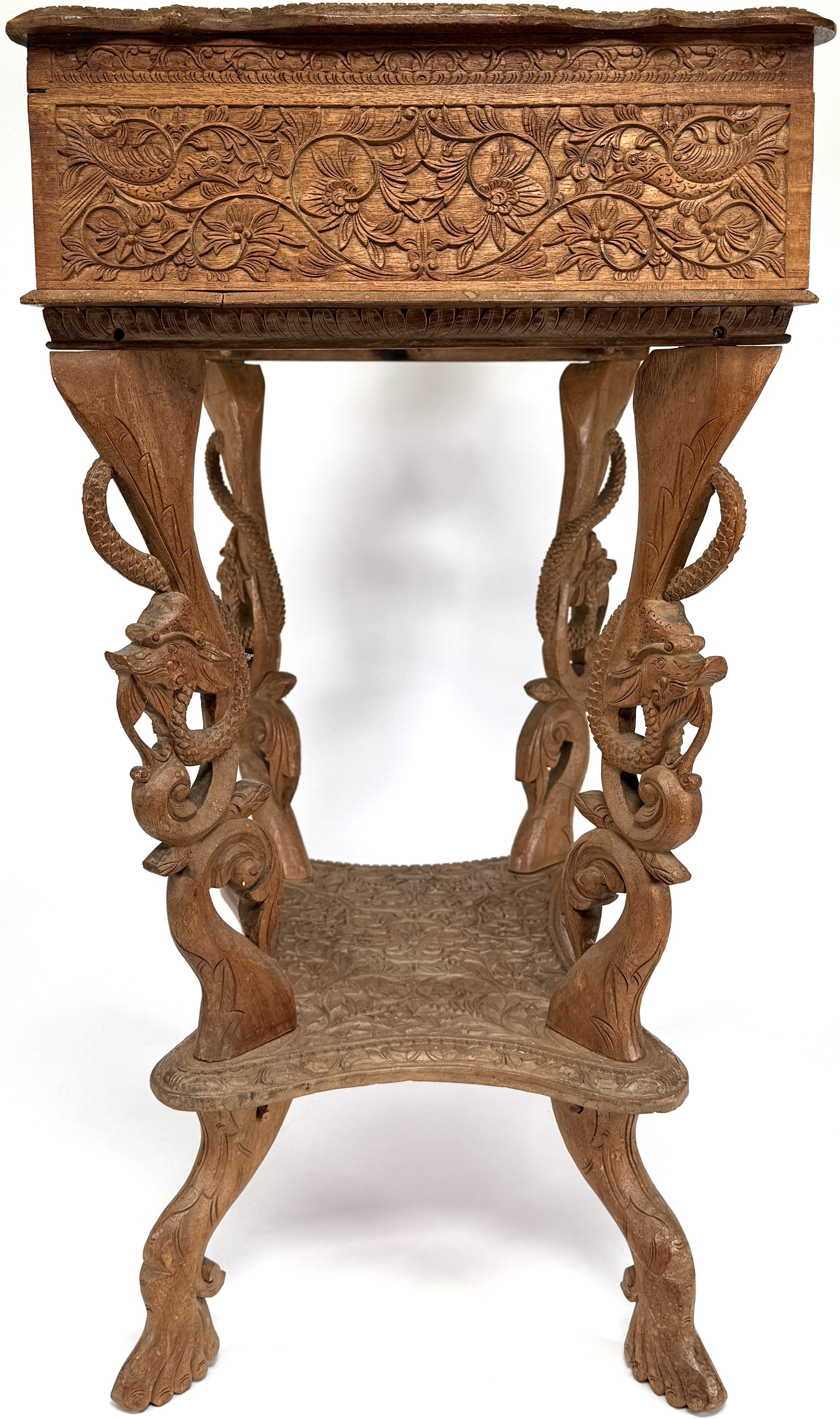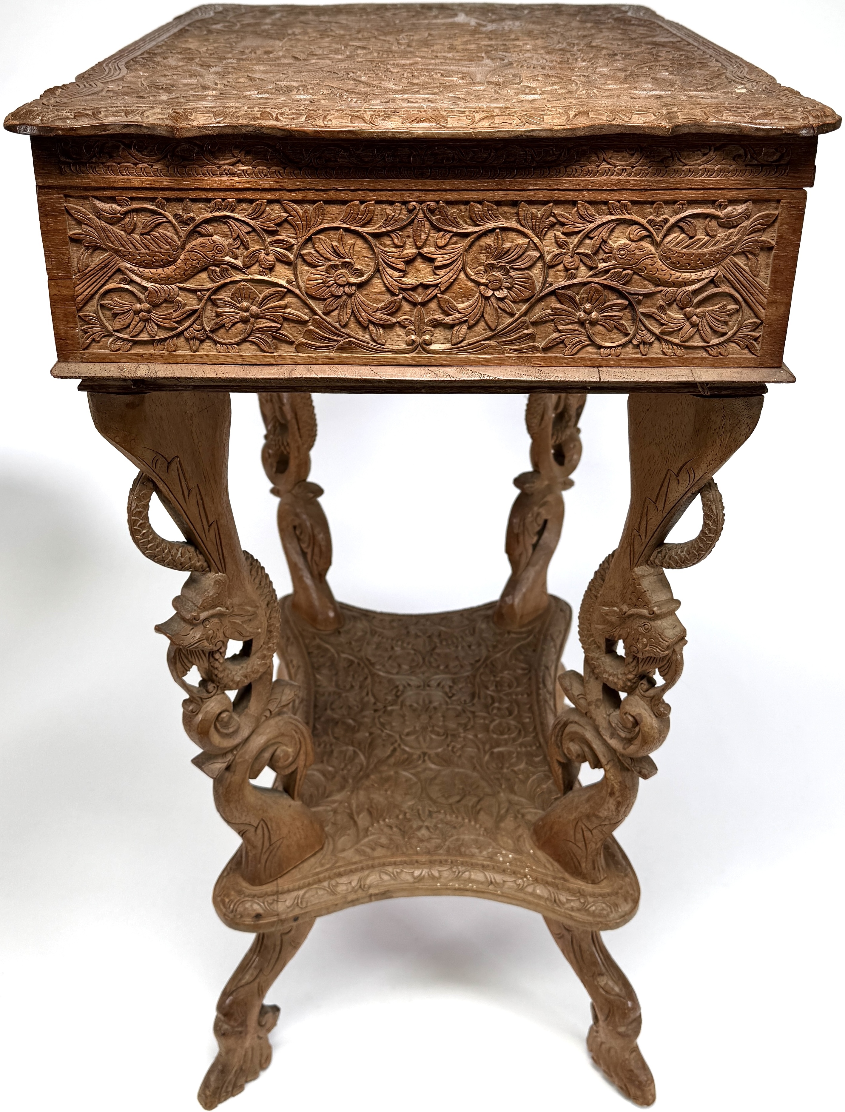 Houten naaitafel met opklapbaar blad, eerste helft 20e eeuw, uitgevoerd in koloniale stijl met Oosterse invloeden. Het meubel is vervaardigd uit gesneden hardhout en rijkelijk versierd met florale motieven, vogels en mythische dieren in diep reliëf. Kenmerkend zijn de opengewerkte poten met drakenkoppen, het gesneden blad met symmetrische decoraties en het afsluitbare binnenvak met uitgesneden paneel. Zeker zijn van deelname? Plaats een schriftelijk bod online! |