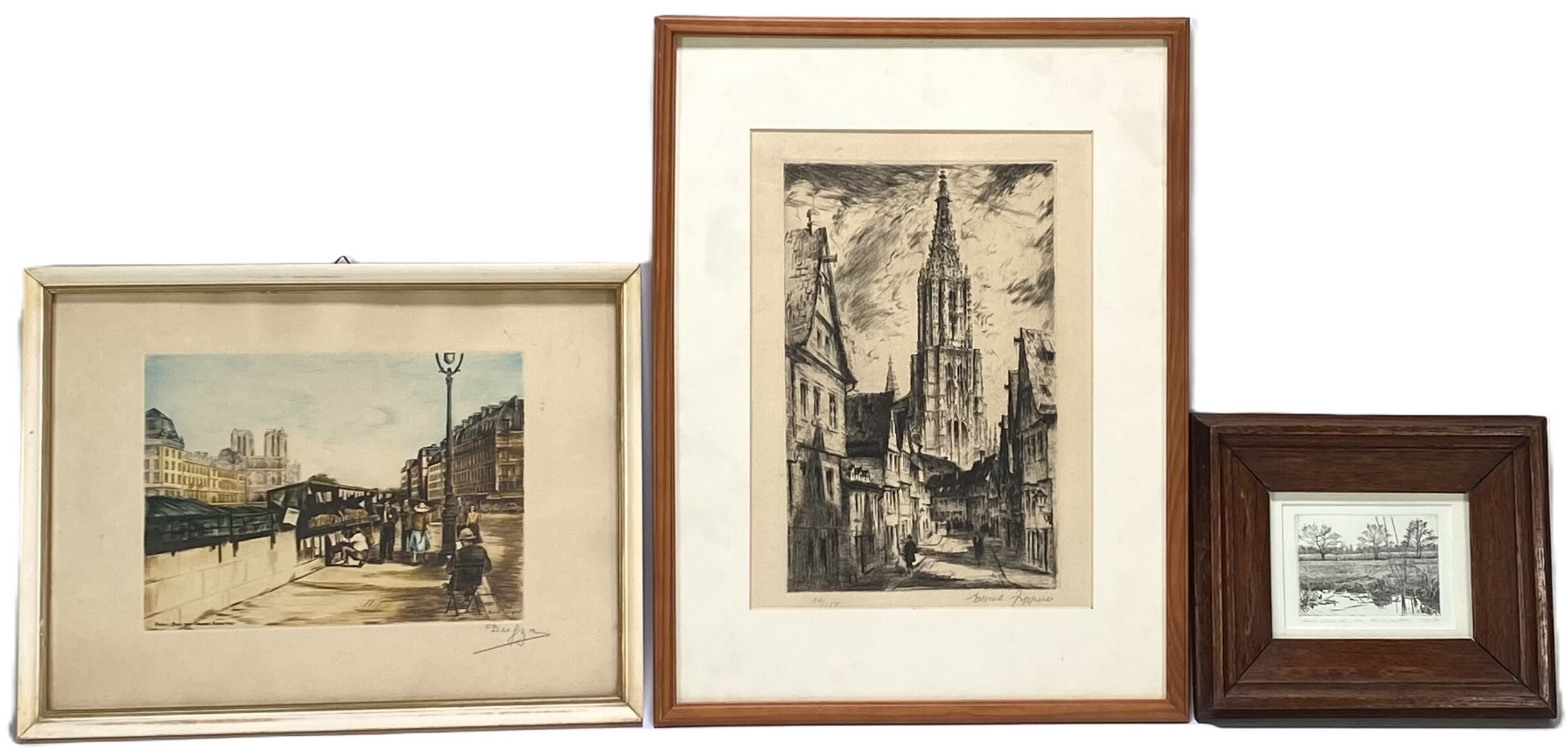 Drie etsen op papier uit de eerste helft 20e eeuw, waaronder Dom Ulm van Ernst Zipperer (1888–1932), Scheipoten van Hans van Hagen en Paris, Quai des Grands Augustins, aangeduid als Burin Original. Deels handgekleurd, voorzien van signaturen en opschrift, de werken tonen stads- en landschapsgezichten en zijn ingelijst in houten en goudkleurige lijsten. Klaar om te bieden? Registreer je nu en doe mee aan de veiling! |