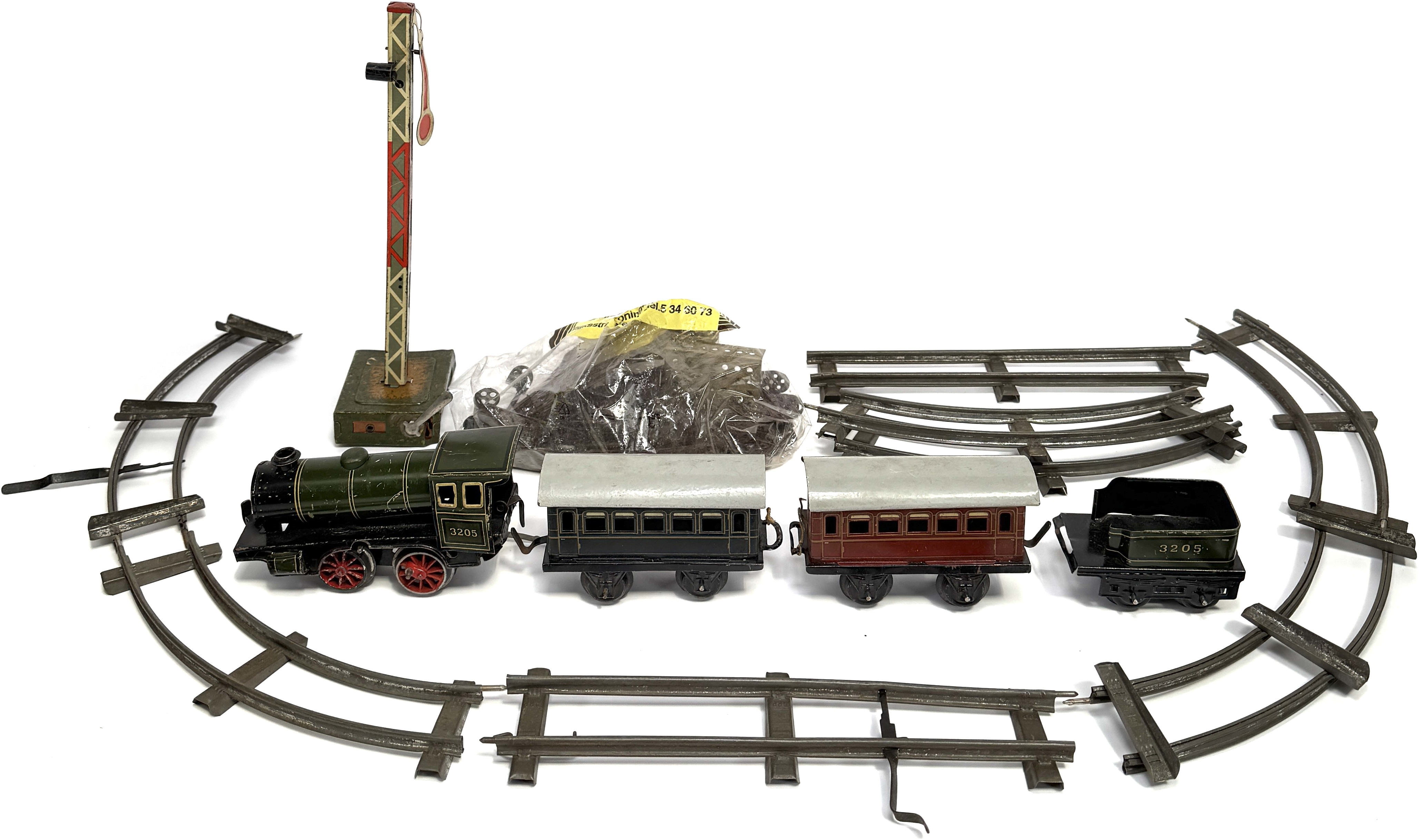 Treinset uit de eerste helft van de 20e eeuw, bestaande uit een groene blikken locomotief met nummer 3205, bijpassende tender, twee passagiersrijtuigen en een reeks metalen rails in gebogen en rechte uitvoering. De set is uitgevoerd in blik met lithografische en geschilderde details en bevat tevens een seinpaal en losse onderdelen. Wil je de treinset in het echt bekijken? Kom naar de kijkdagen op 29, 30 en 31 augustus! |