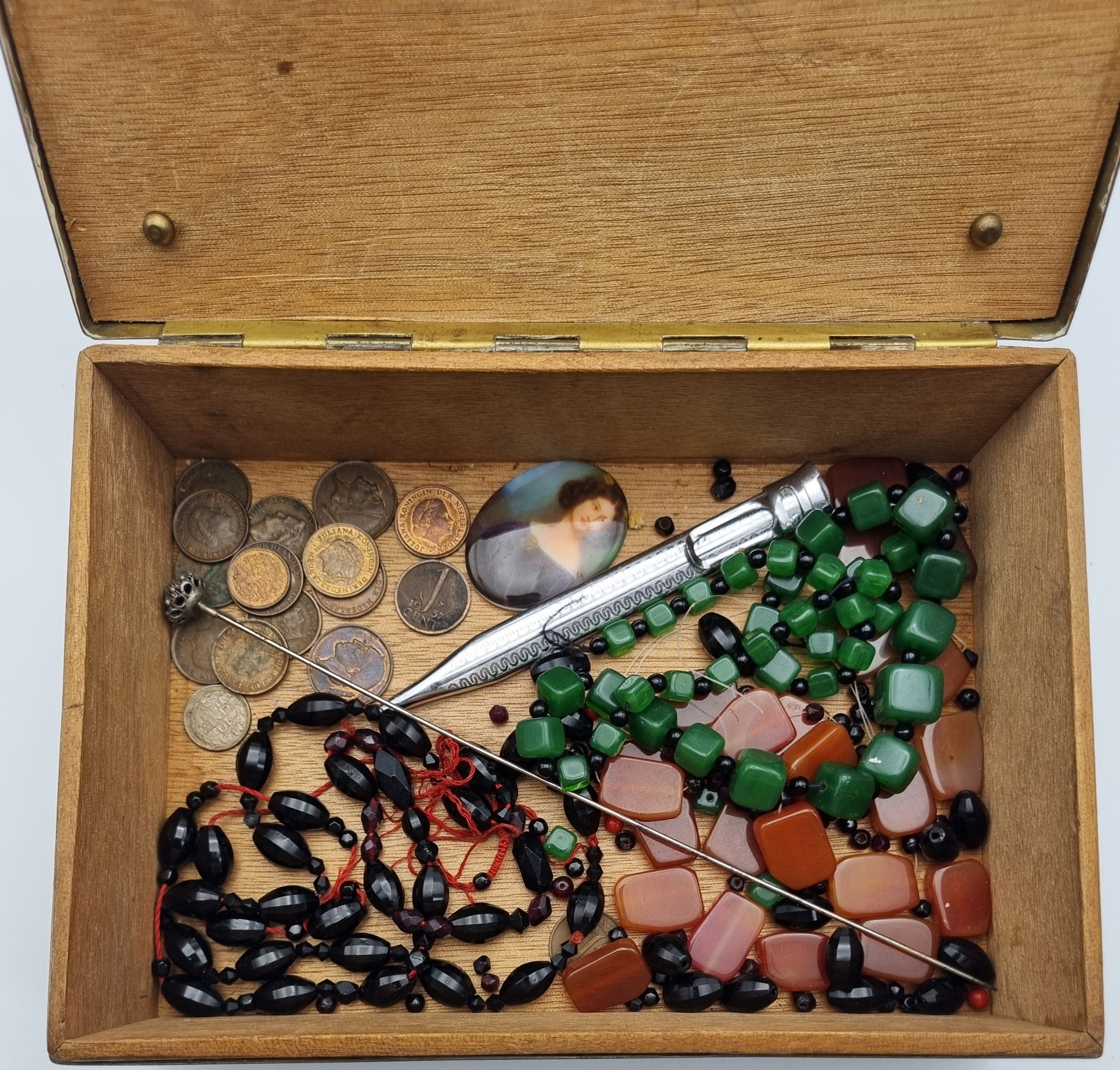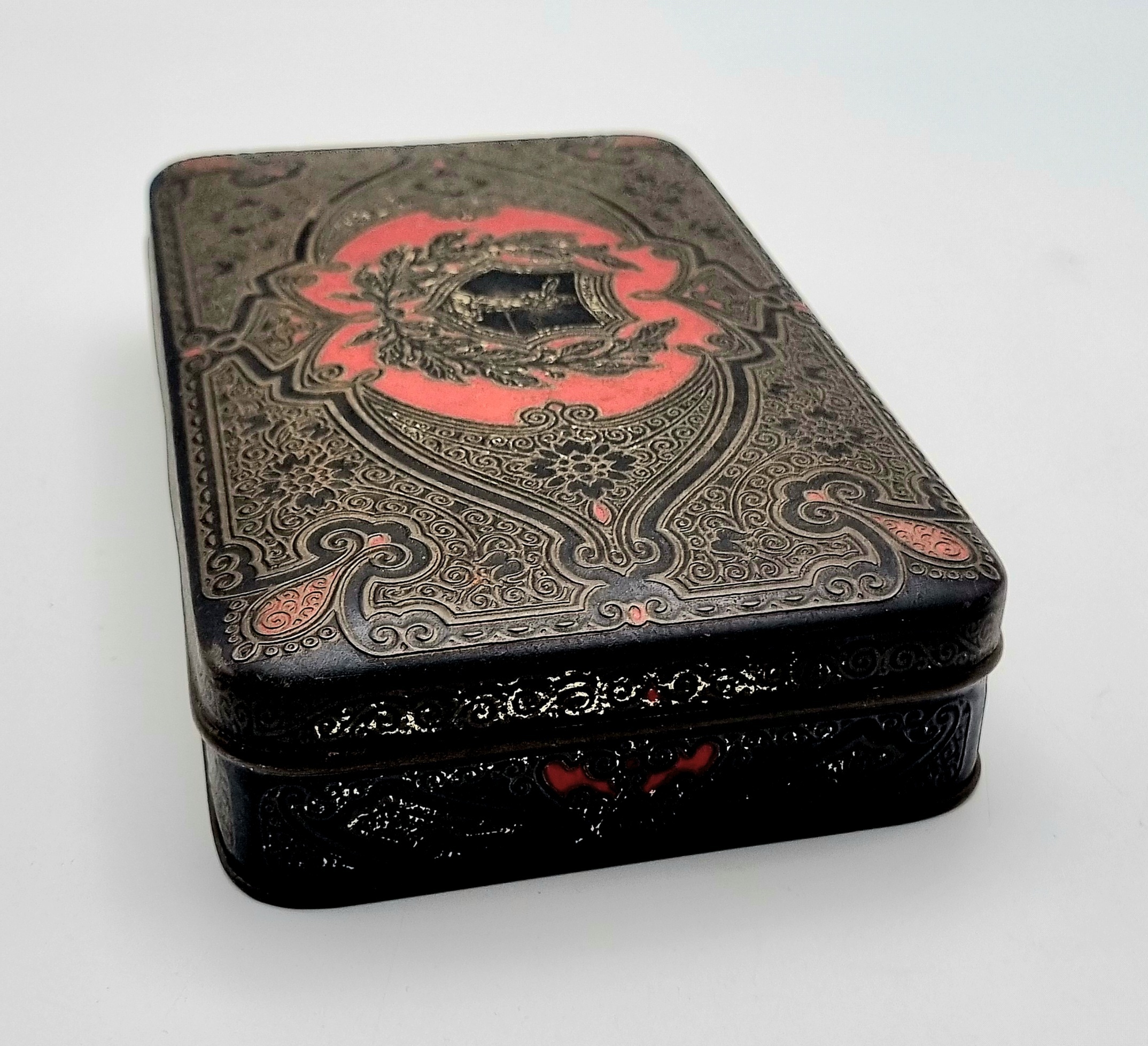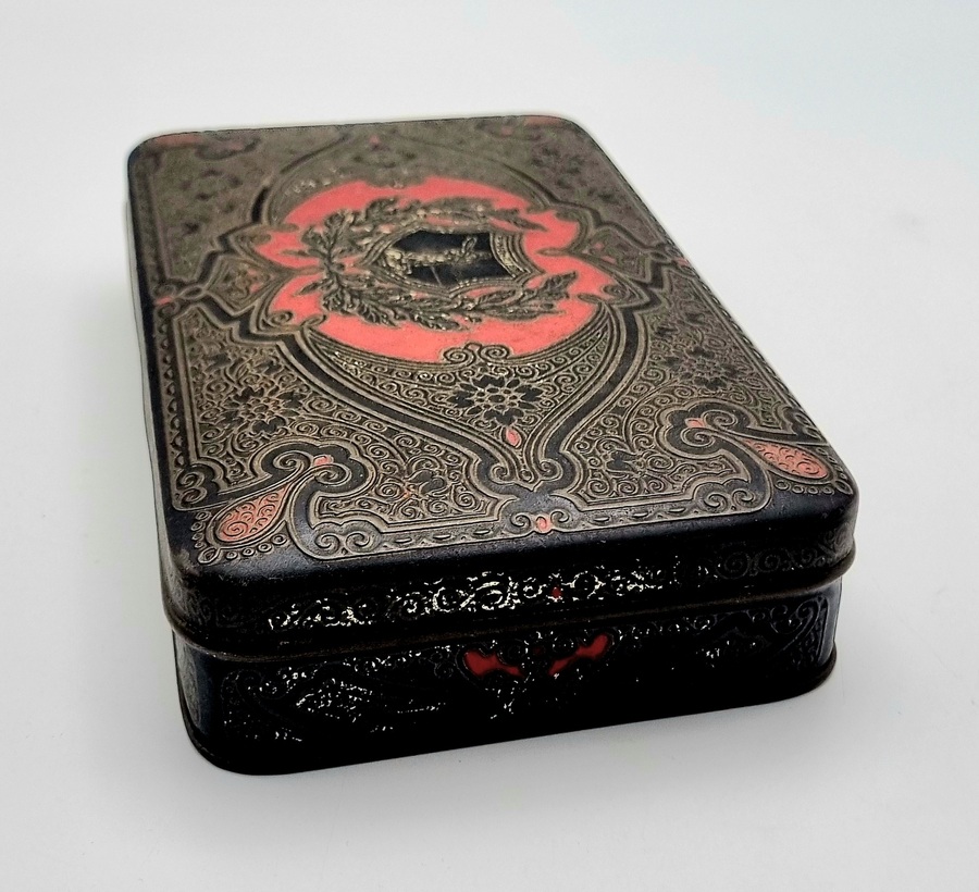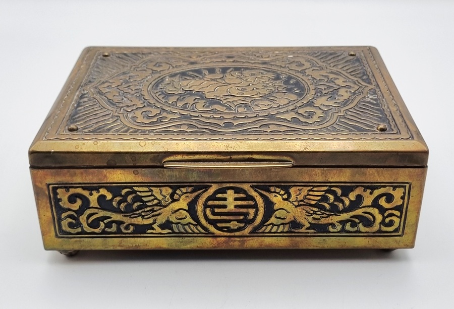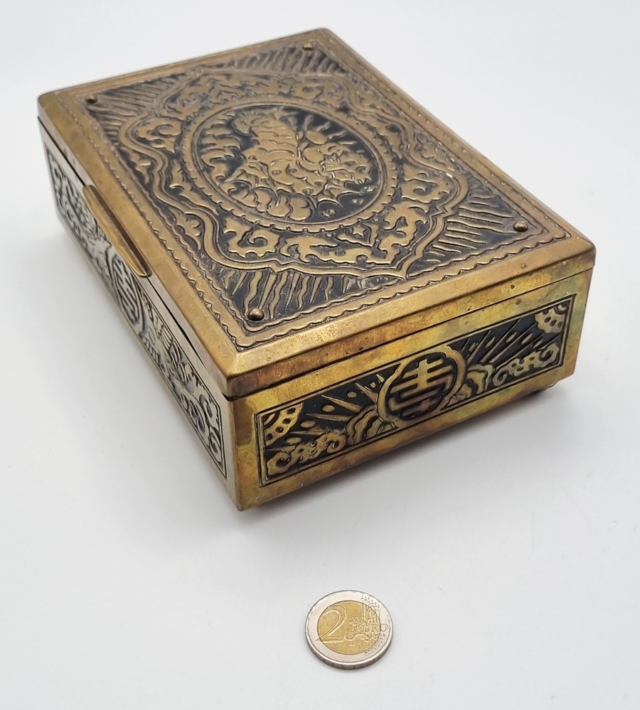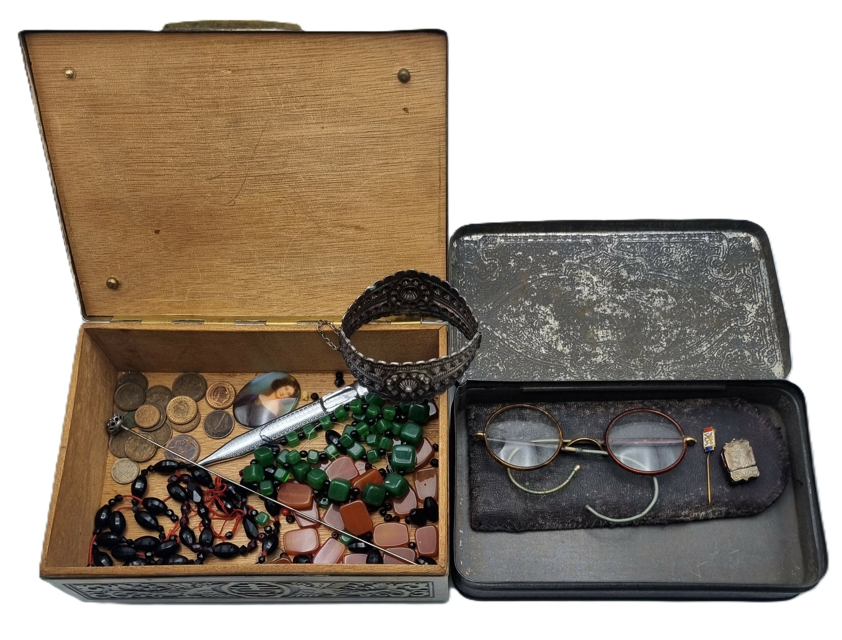 Een houten met messing kistje en een metalen blikje met een gedrukte decoratie. Het kistje met een bewerking in reliëf van draken en vogels, bevat diverse sieraden en munten. Het blikje is gedecoreerd met een krans en een schild en bevat een bril en speld. Het kistje en het blikje dateren uit begin 20e eeuw. Registreer nu en bied eenvoudig online mee op deze kistje en blik met inhoud. |