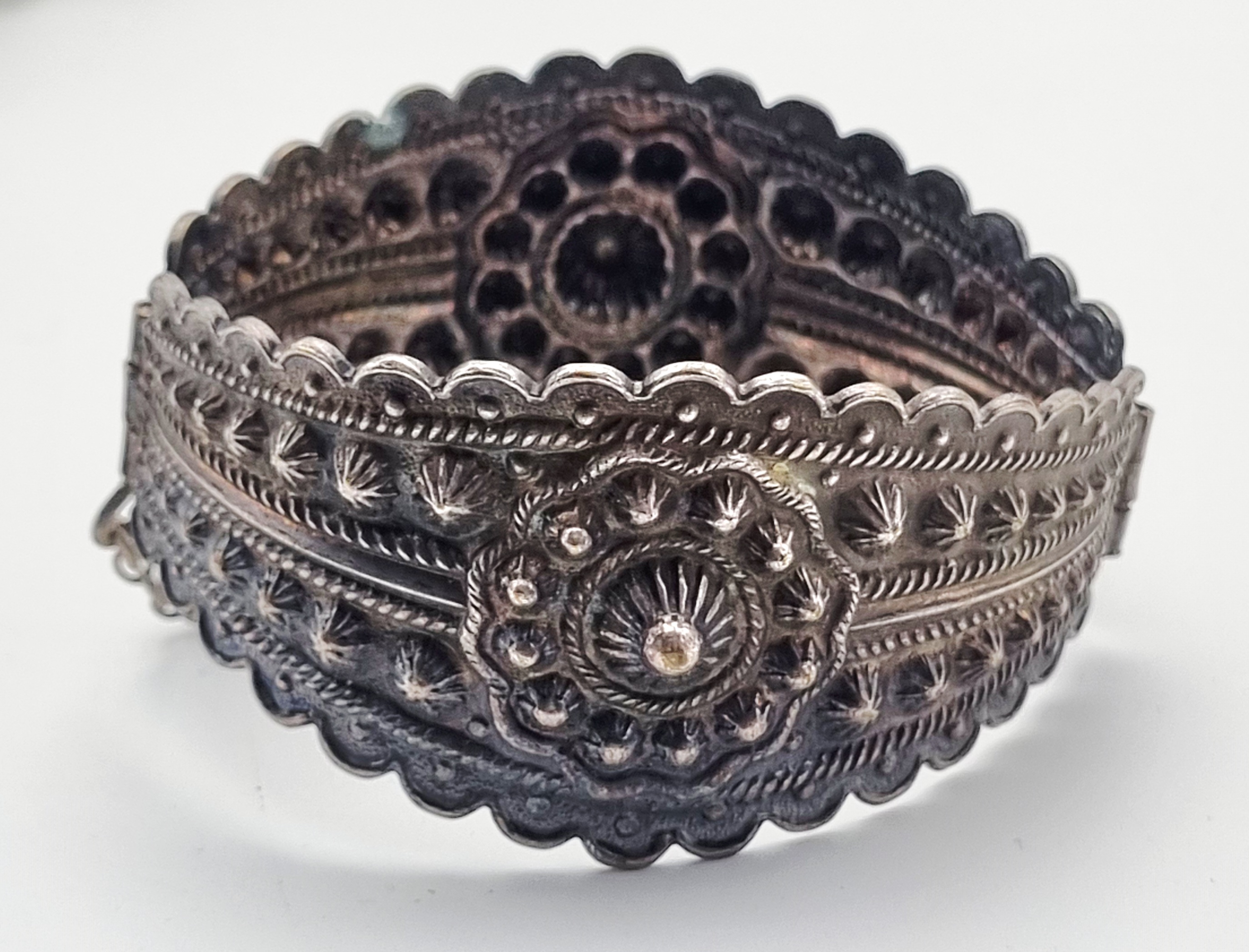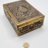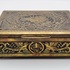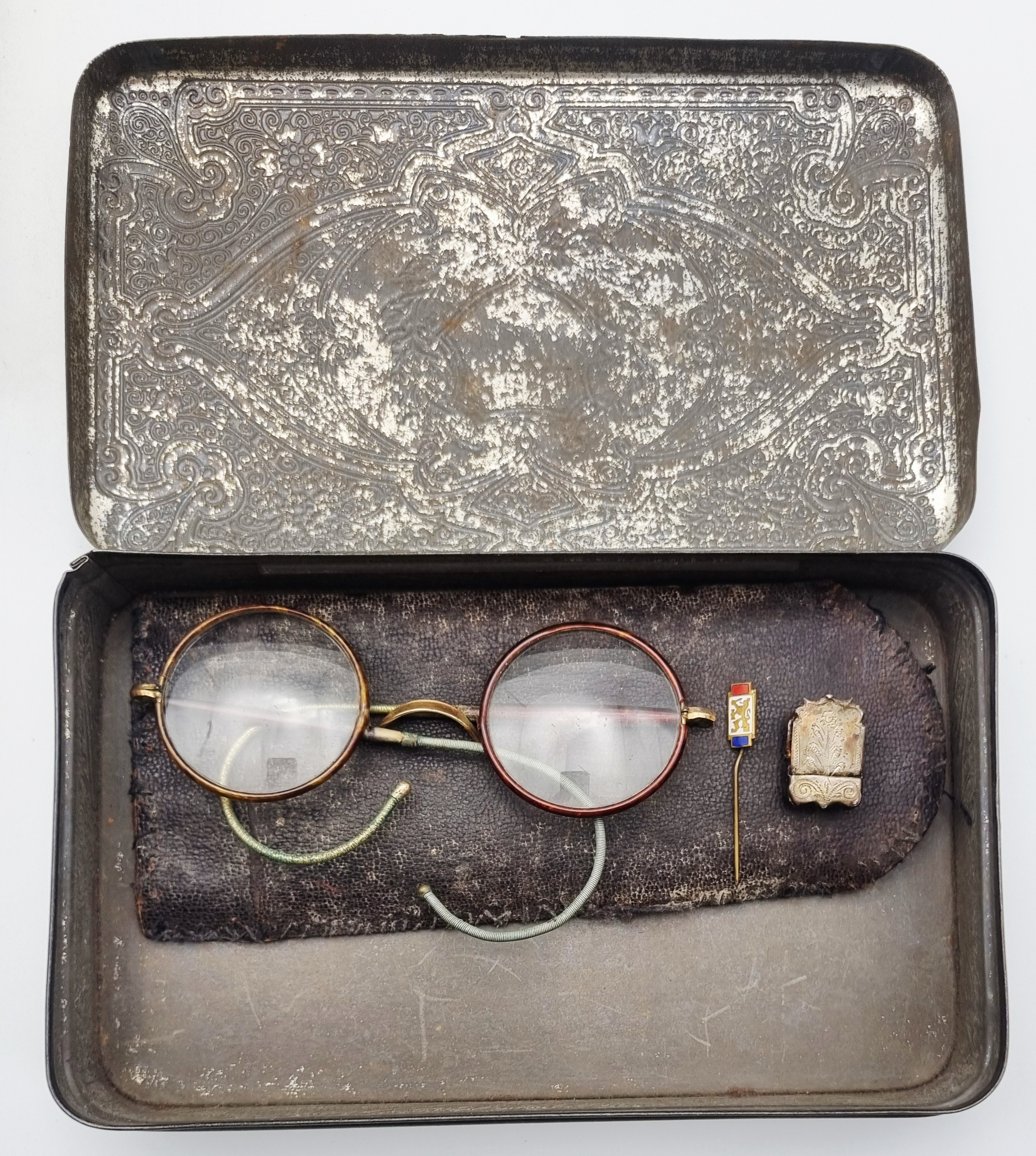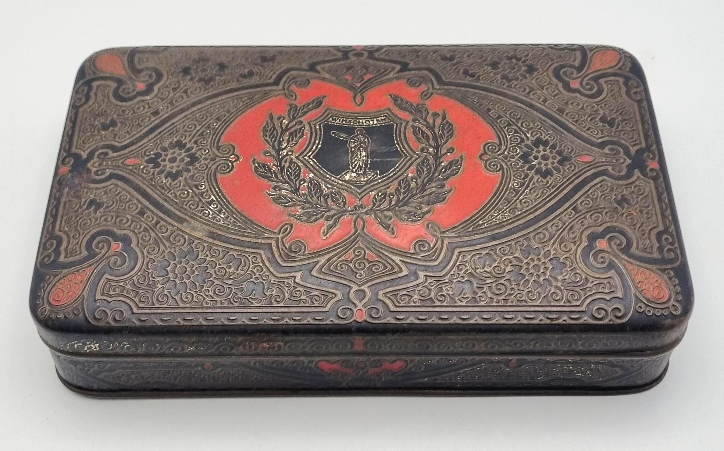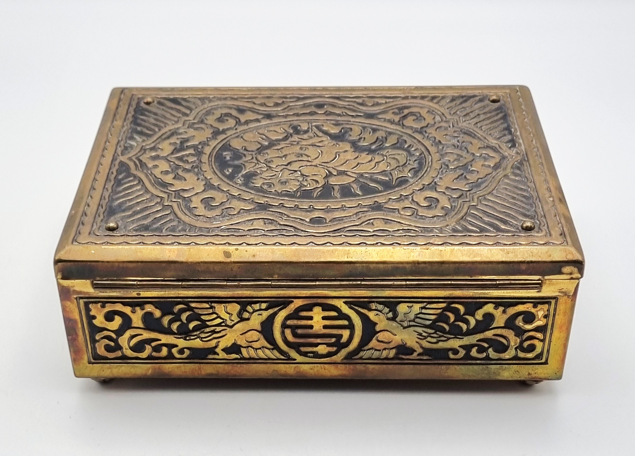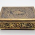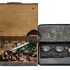 Een houten met messing kistje en een metalen blikje met een gedrukte decoratie. Het kistje met een bewerking in reliëf van draken en vogels, bevat diverse sieraden en munten. Het blikje is gedecoreerd met een krans en een schild en bevat een bril en speld. Het kistje en het blikje dateren uit begin 20e eeuw. Registreer nu en bied eenvoudig online mee op deze kistje en blik met inhoud. |