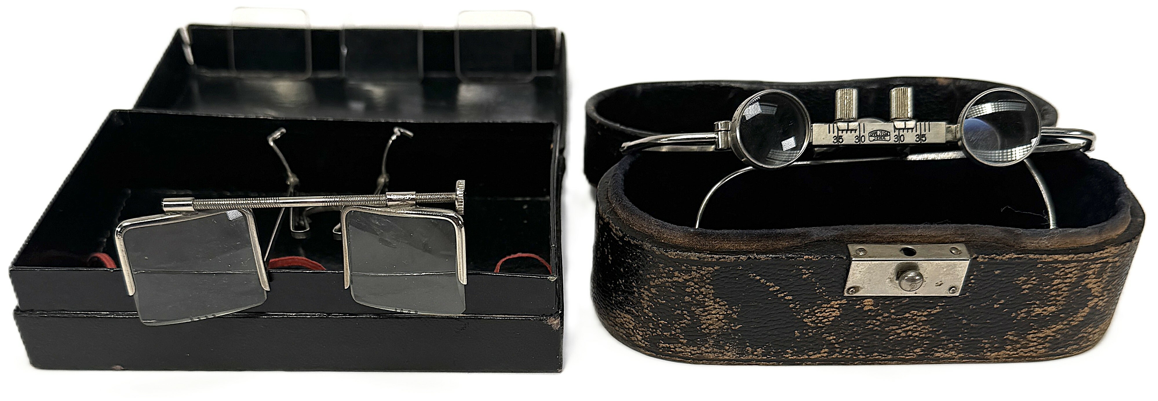 Vergrootglas brilletjes, omstreeks midden 20e eeuw, uitgevoerd in metaal en glas met leren etui. Een verstelbare bril met rechthoekige lenzen en een optisch brilletje met ronde vergrotingslenzen en schaalverdeling, gemerkt op de bovenzijde Carl Zeiss Jena. Ontworpen voor precisiewerk en wetenschappelijke toepassingen binnen optiek en laboratoriumgebruik. Geïnteresseerd? Bezoek onze kijkdagen op 29, 30 of 31 augustus van 11:00 tot 17:00 uur!! |