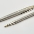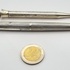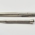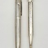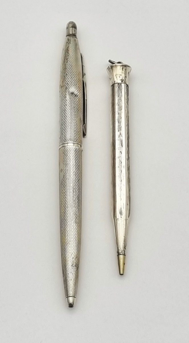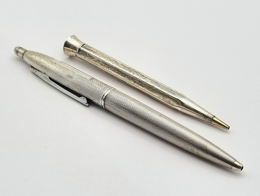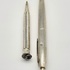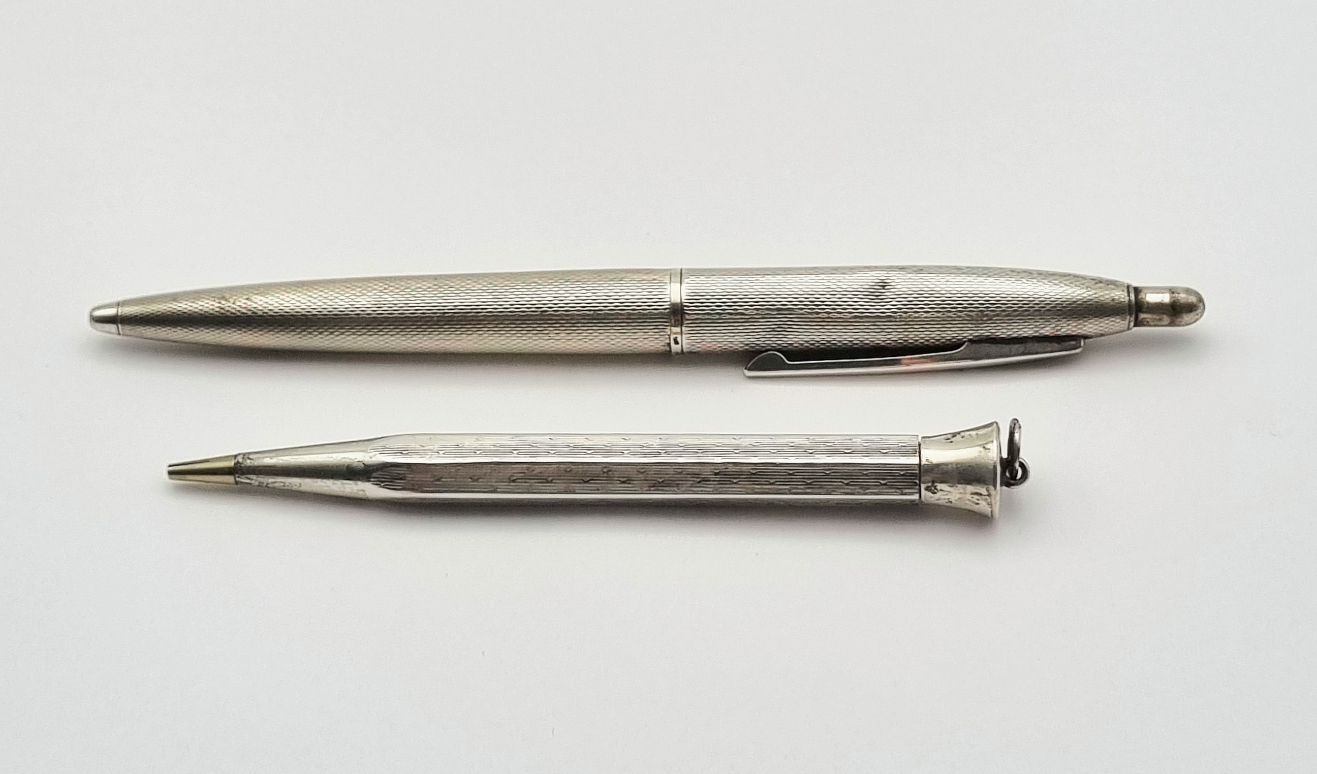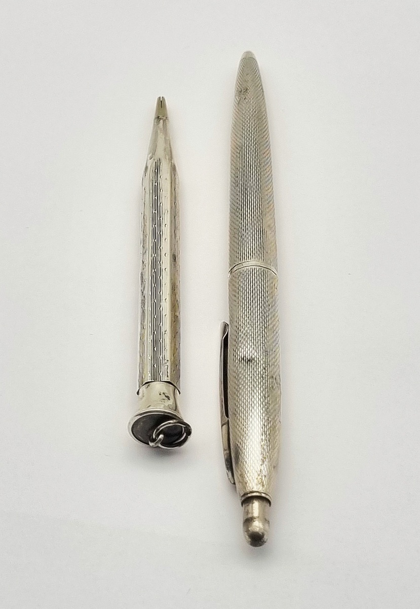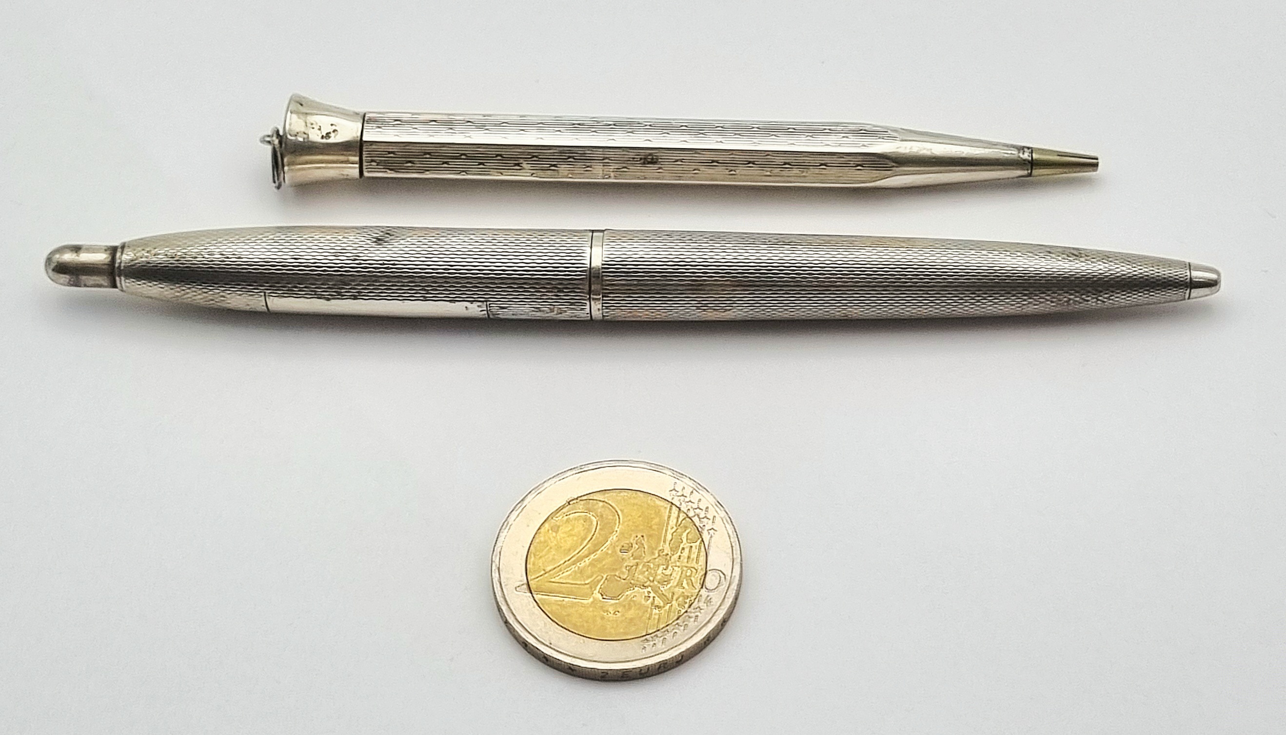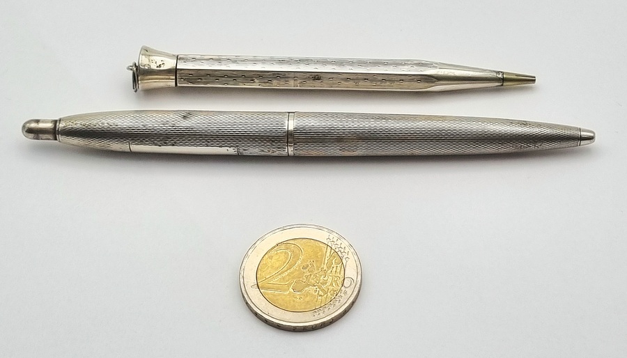 Een zilveren schrijfset uit circa 1950, bestaande uit een vulpen en een potlood. De set is uitgevoerd in een modernistische stijl. De vulpen en potlood hebben een zilveren behuizing met een guilloché gravering in een ruitvormig patroon. Het zilvergehalte is 835, aangegeven door markeringen op de zijkant. Het potlood heeft een goudkleurige punt. Geïnteresseerd? Bezoek onze kijkdagen voor een persoonlijke bezichtiging! |