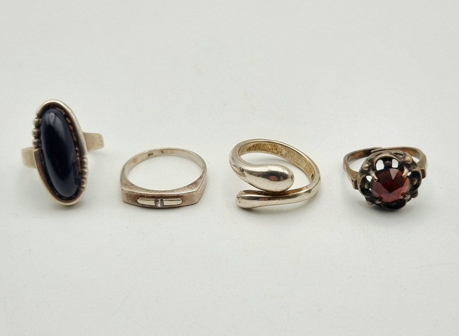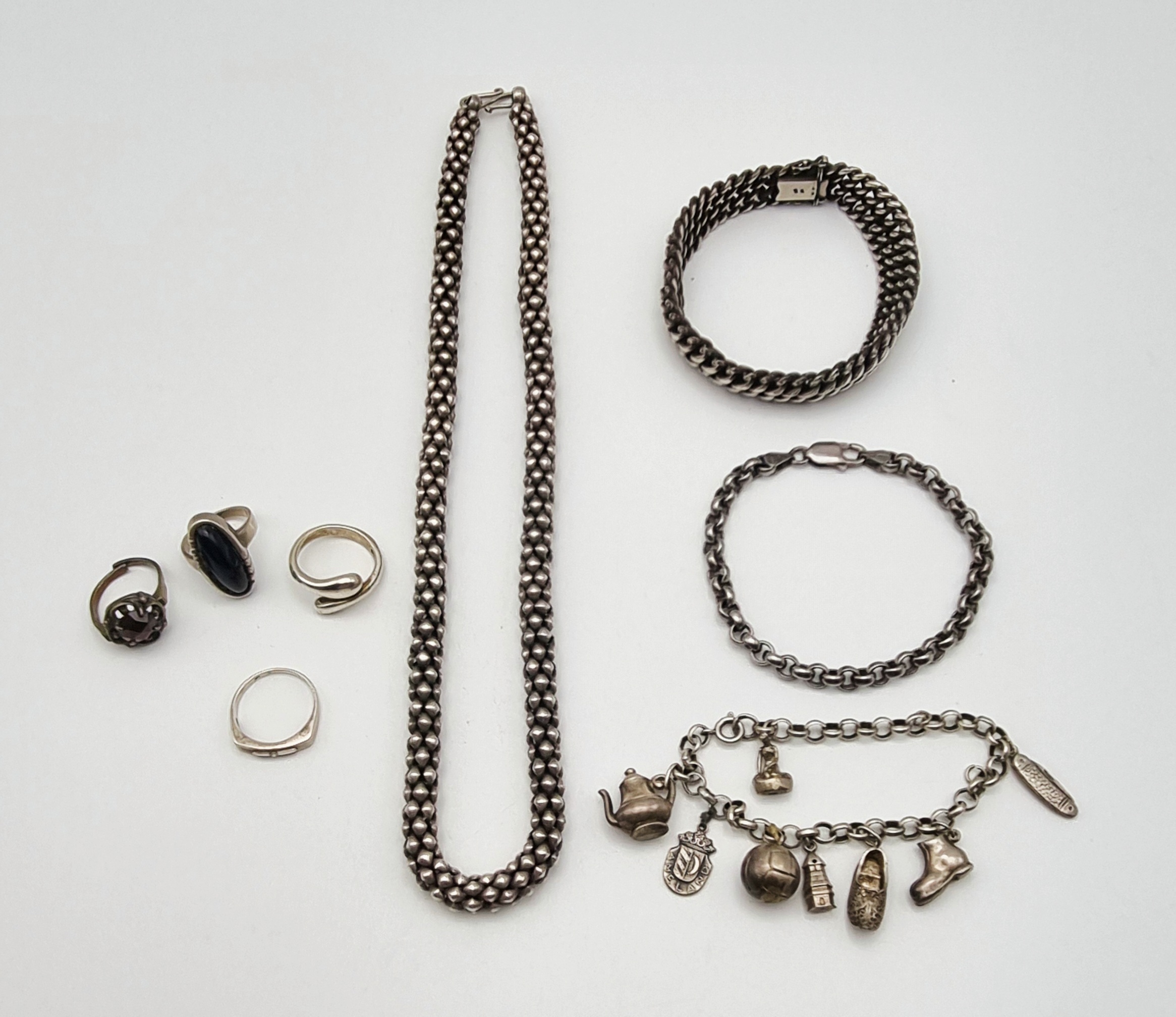 Een verzameling van zilveren sieraden uit het midden van de 20e eeuw, in Art Deco en neoclassicistische stijl. Bestaand uit uit drie armbanden, een ketting en vier ringen. De objecten zijn vervaardigd uit zilver met een gehalte van 835 en zijn voorzien van diverse keurmerken. Kom langs tijdens de kijkdagen (29 t/m 31 augustus) en ontdek de sieraden zelf! |