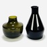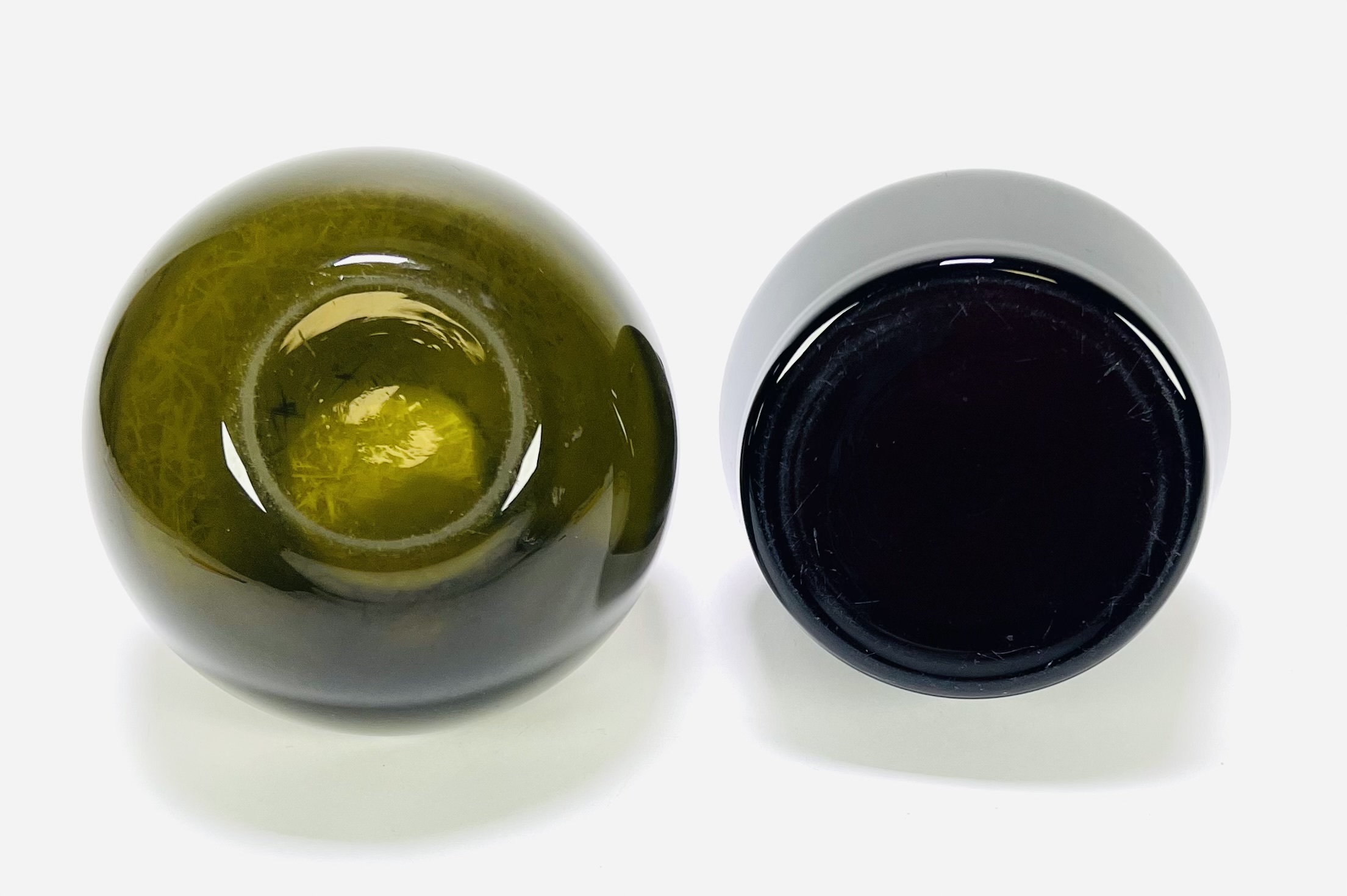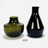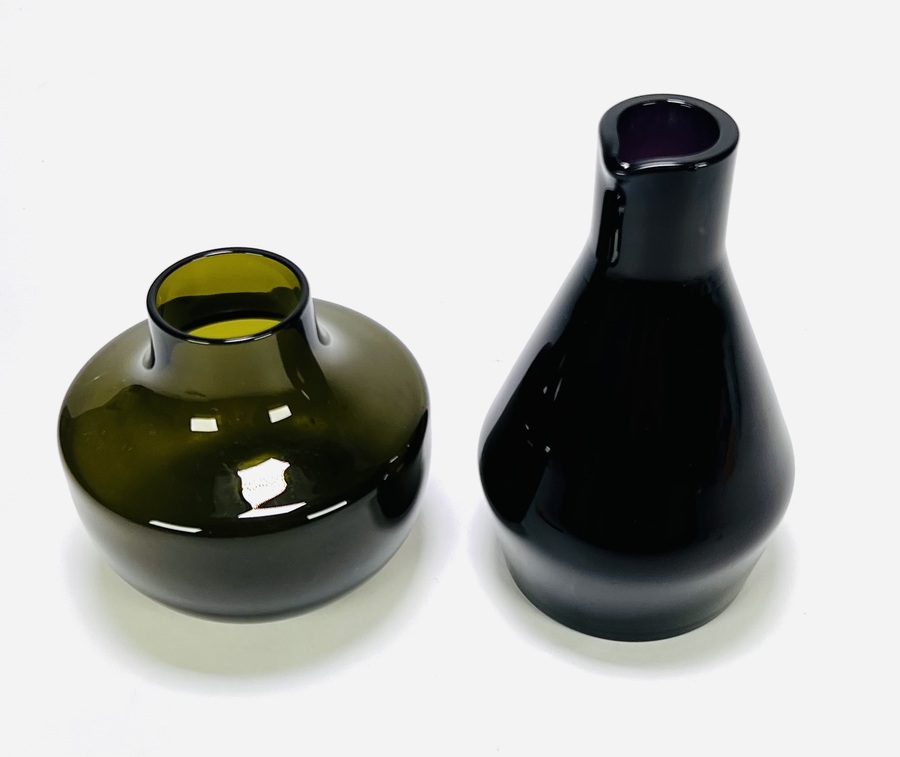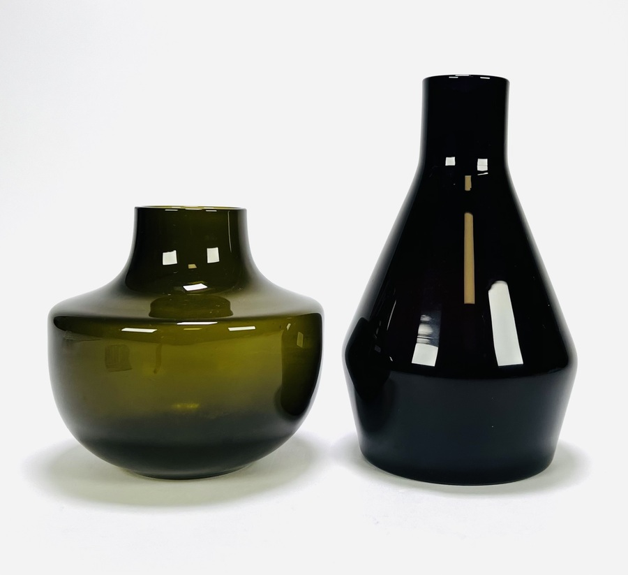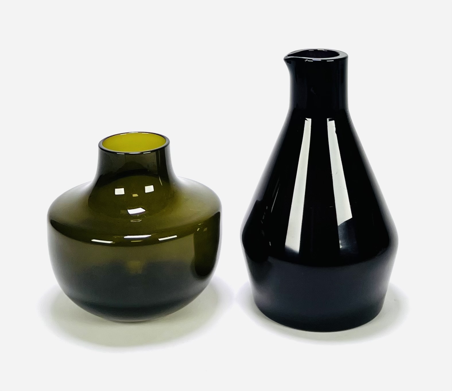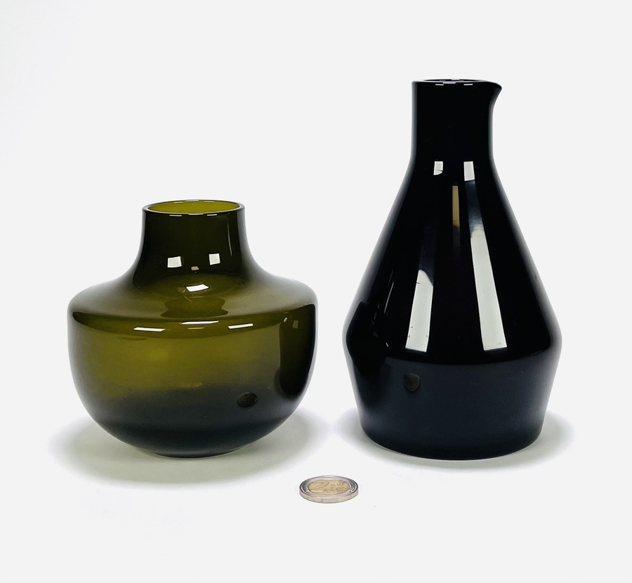 Een olijfgroene glazen vaas Ludwig-Breit-Wiesenthalhütte en een zwarte glazen schenkkan, beide uit de midden 20e eeuw, uitgevoerd in modernistische stijl. De vaas heeft een bolvormig lichaam met cilindervormige hals en een zichtbare pontil aan de onderzijde, terwijl de kan is uitgevoerd met een strakke, geometrische vorm en een smalle tuit. Deze vaas en schenkkan zelf beoordelen? Je bent welkom op onze kijkdagen op 29, 30 en 31 augustus |