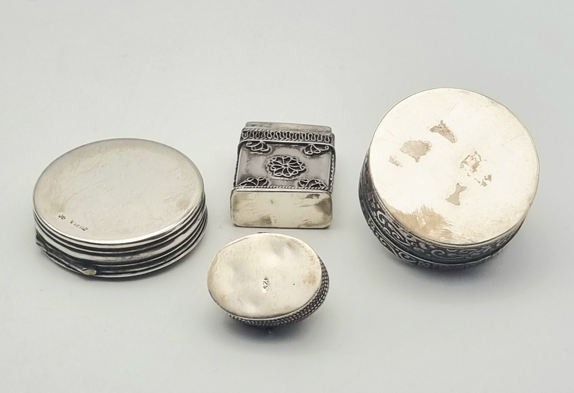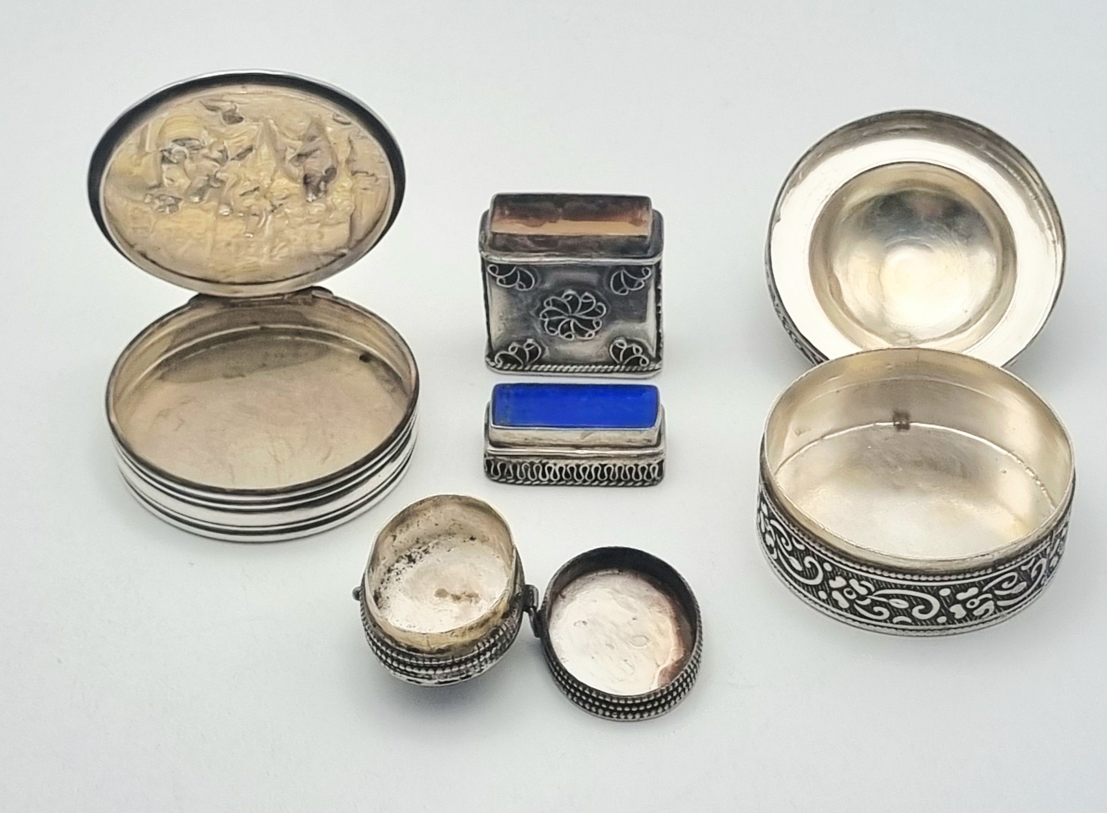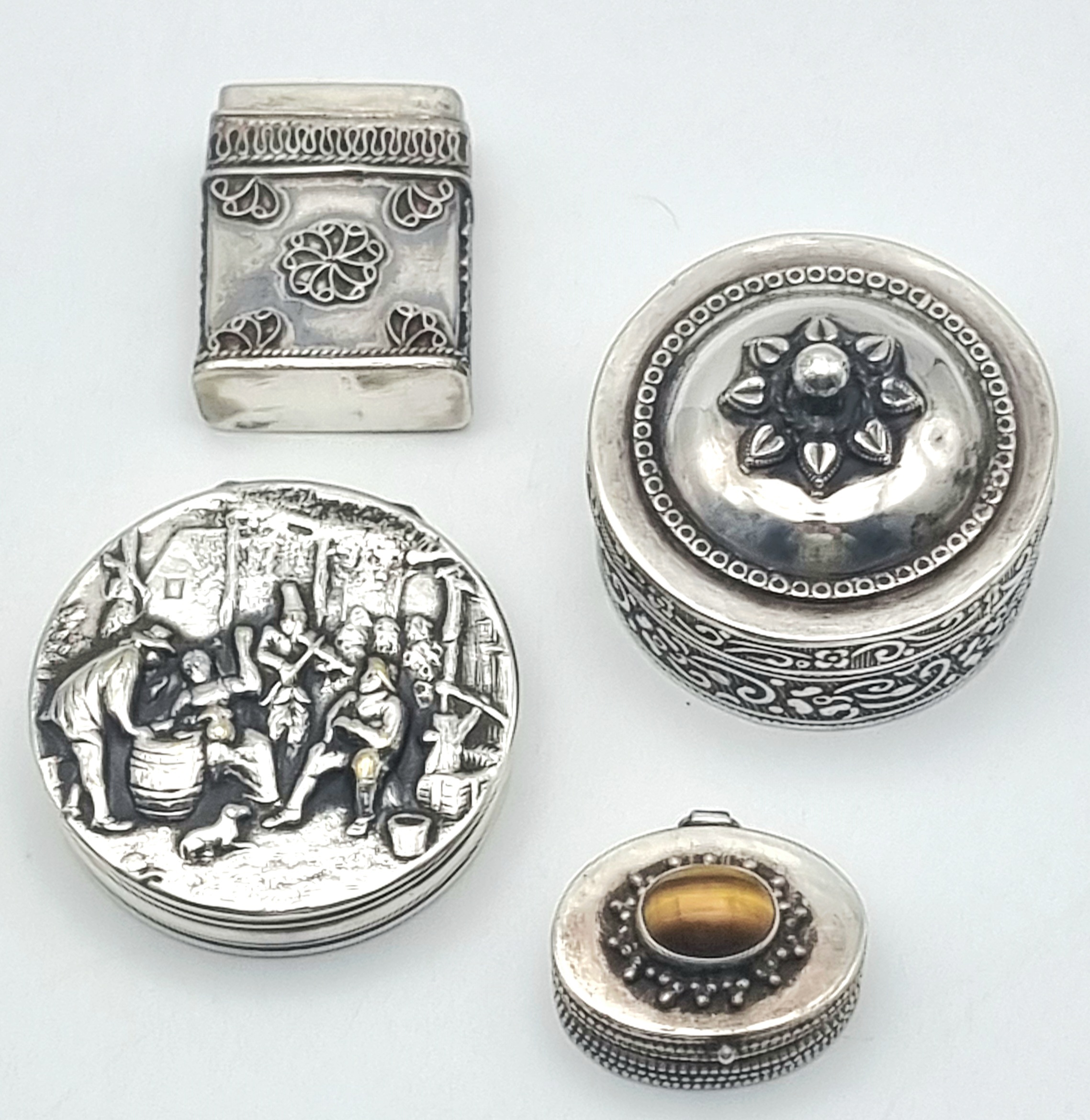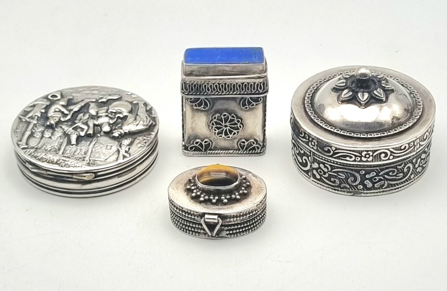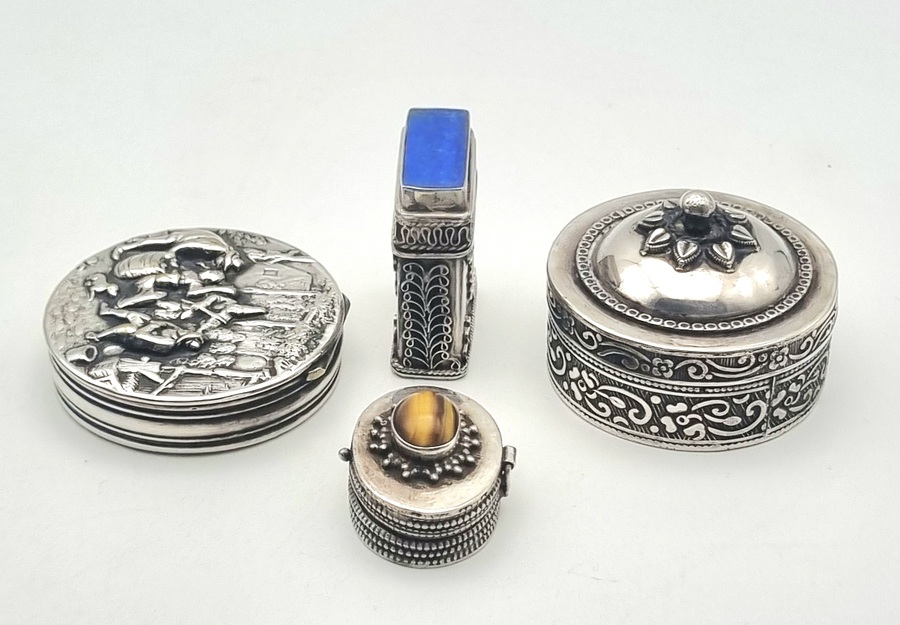 Een diverse set pillendoosjes, kleinste van zilver en andere drie verzilverd metaal uit circa eind 19e eeuw. De doosjes zijn uitgevoerd in verschillende stijlen, waaronder neobarok en etnisch. De doosjes zijn gedecoreerd met motieven en ingelegd met lapis lazuli en tijgeroog. Een doosje is gemerkt met 'V & N' aan de onderzijde. Wil je direct deelnemen? Plaats alvast een schriftelijk bod via onze website! |