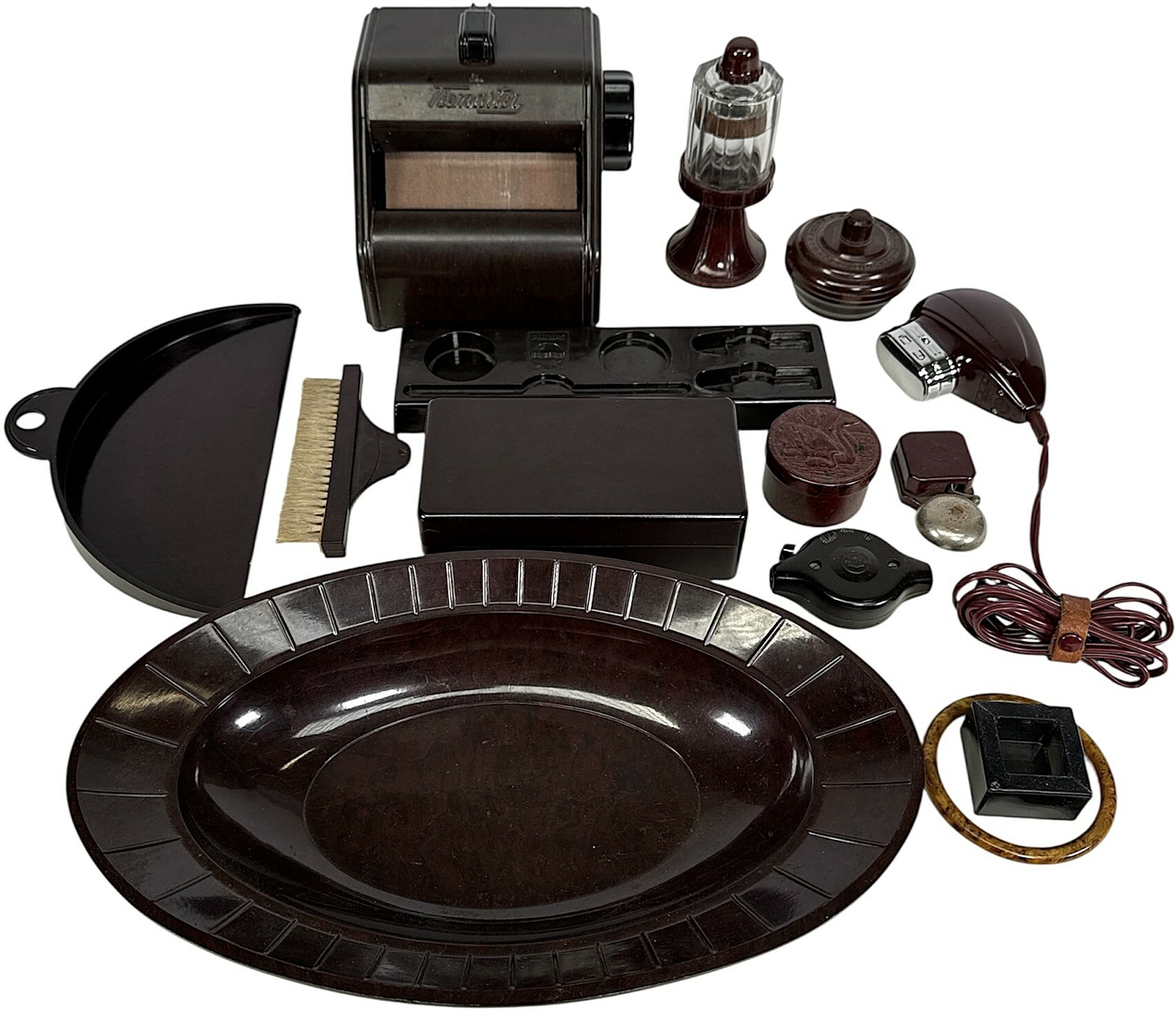 Collectie bakeliet uit circa 1950 bestaat uit onder andere een ovale schaal en diverse doosjes, vervaardigd in de stijl van het functionalisme, kenmerkend door strakke lijnen. Deze accessoires werden geproduceerd via spuitgiet- en perstechnieken, wat gebruikelijk was voor bakelieten objecten uit die tijd. Geïnteresseerd? Bezoek onze kijkdagen op 29, 30 of 31 augustus van 11:00 tot 17:00 uur! |