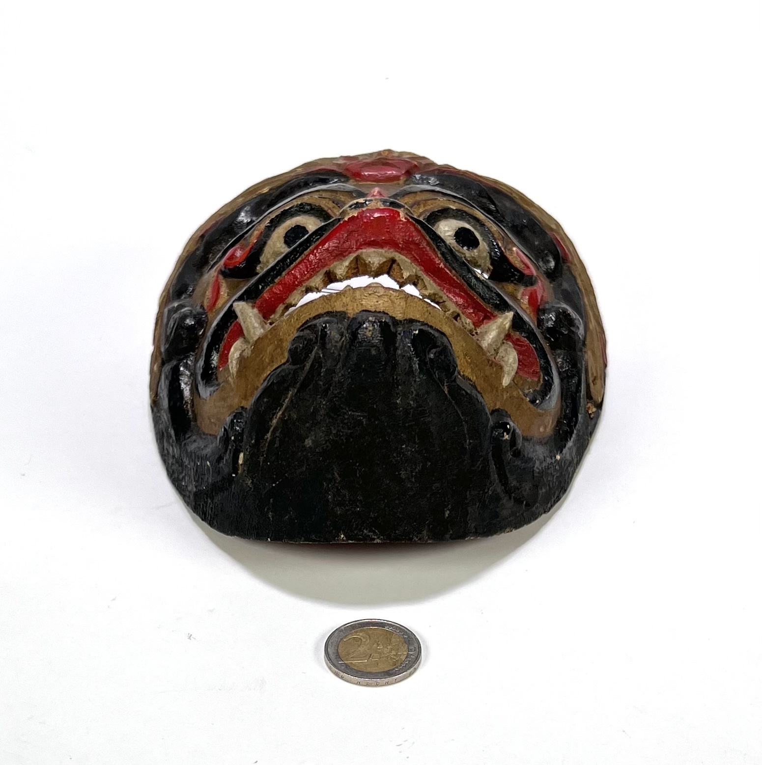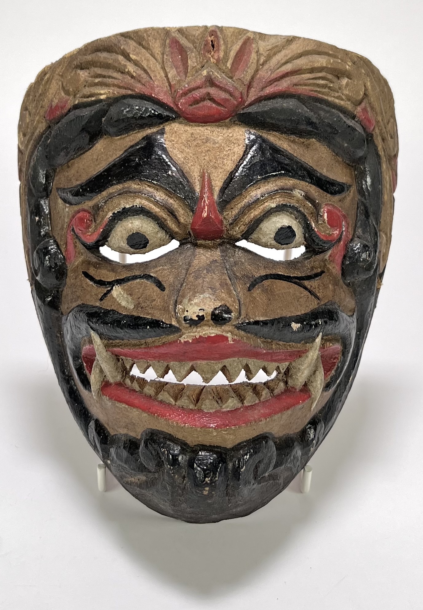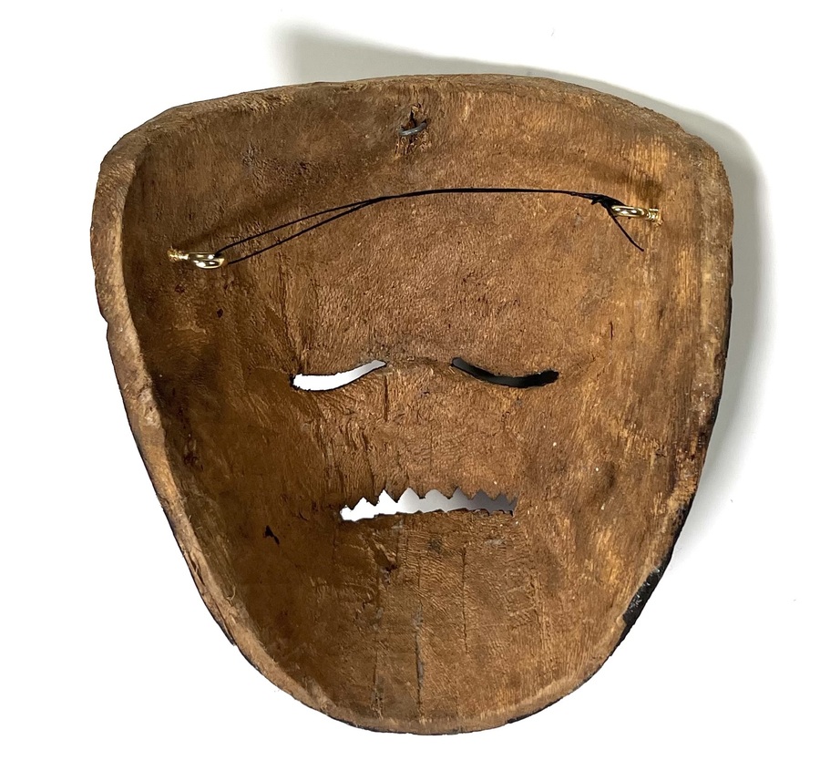 Javaans wandmasker van gesneden hout, midden 20e eeuw, in traditionele stijl met demonische voorstelling. Heet masker is handgesneden en polychroom beschilderd in rood, zwart en beige tinten. Kenmerkend zijn de grote ogen, zware wenkbrauwen en de open mond met gesneden tanden. Het masker heeft een ruw uitgeholde achterzijde met eenvoudige ophanging in metaal. Geïnteresseerd? Bezoek onze kijkdagen op 29, 30 of 31 augustus van 11:00 tot 17:00 uur! |