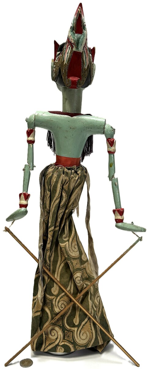 Wayang golek-pop "Hanila" uit Bogor, West-Java, vervaardigd in de tweede helft van de 20e eeuw. De pop is uitgevoerd in hout met polychromie, textiel en bamboe, toegepast voor de aansturing. De pop heeft een grotesk hoofd met open mond, opvallende tanden en goudkleurige kroon, groen beschilderde armen en een rok van traditioneel batiktextiel, gecombineerd met rood borststuk, paarse franjes en groene pailletten. Klaar om te bieden? Registreer je nu en doe mee aan de veiling! |