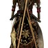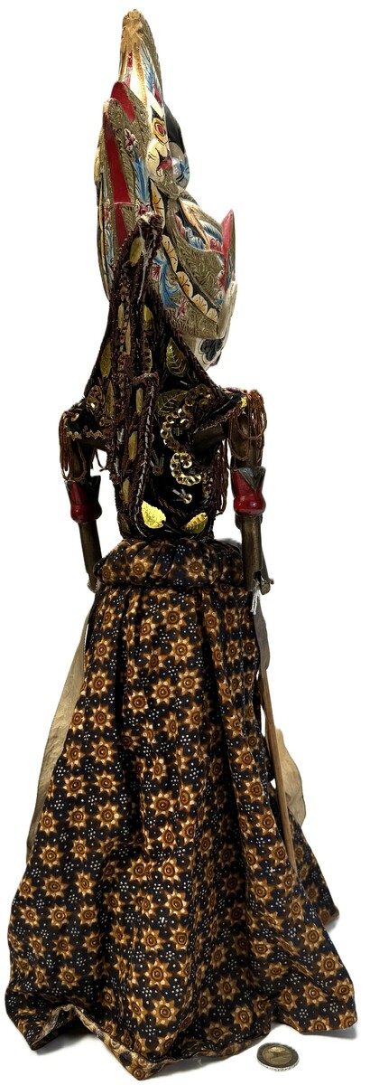 Wayangpop "Gatot Kaca", gesneden door M. Ahim, begin midden 20e eeuw, afkomstig uit West-Java. De pop is vervaardigd uit hout, textiel en kralen, met handmatige snij- en schildertechniek. Kenmerkend zijn het expressieve hoofd met rode ogen, de hoge kroonvormige hoofdbedekking, de batikrok met stervormig patroon en het rijk met pailletten gedecoreerde hes. Klaar om te bieden? Registreer je nu en doe mee aan de veiling! |