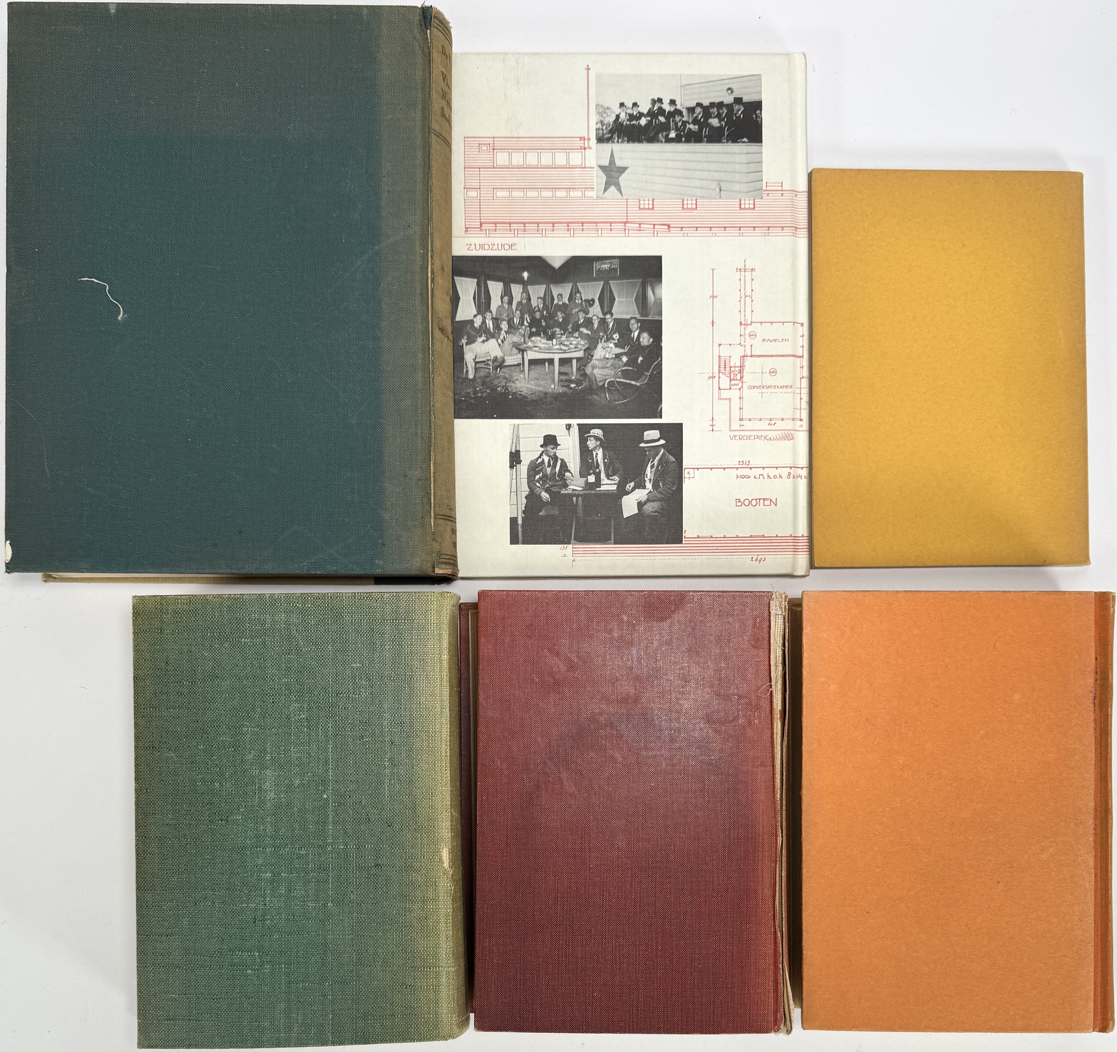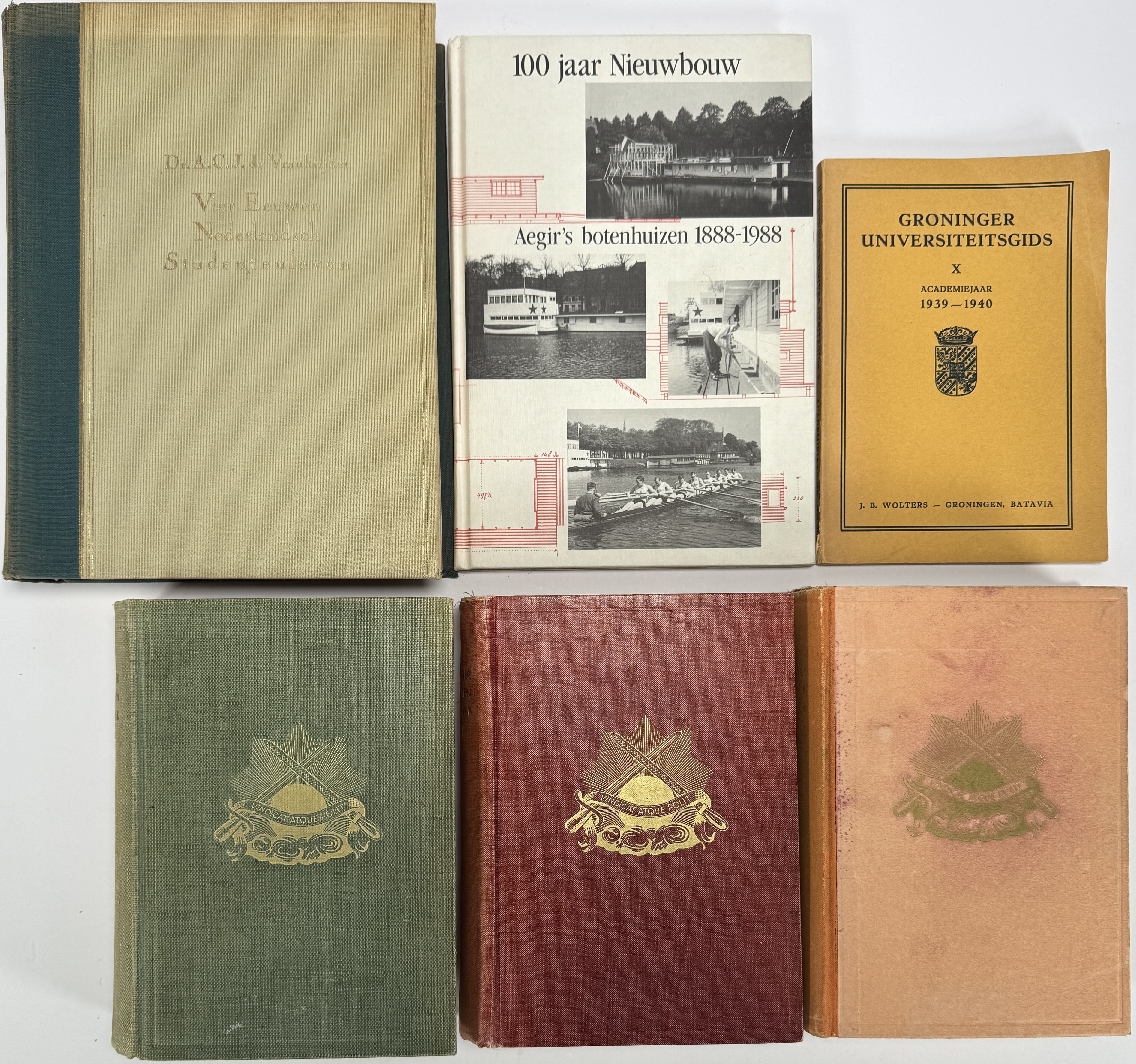 De Groninger Studentenalmanak jaargangen 1940, 1941 en 1946, Vier eeuwen Nederlandsch Studentenleven, Aegir’s botenhuizen 1888-1988 en de Groninger Universiteitsgids-academiejaar 1939-1940. Hardcover, linnen en halflinnen edities, m.u.v. De Groninger Universiteitsgids (paperback) en Aegir’s botenhuizen (gekartonneerd). Naam (handtekening) en soms datering in inkt op de binnenzijde van de voorplatten. Klaar om te bieden? Registreer je nu en doe mee aan de veiling! |