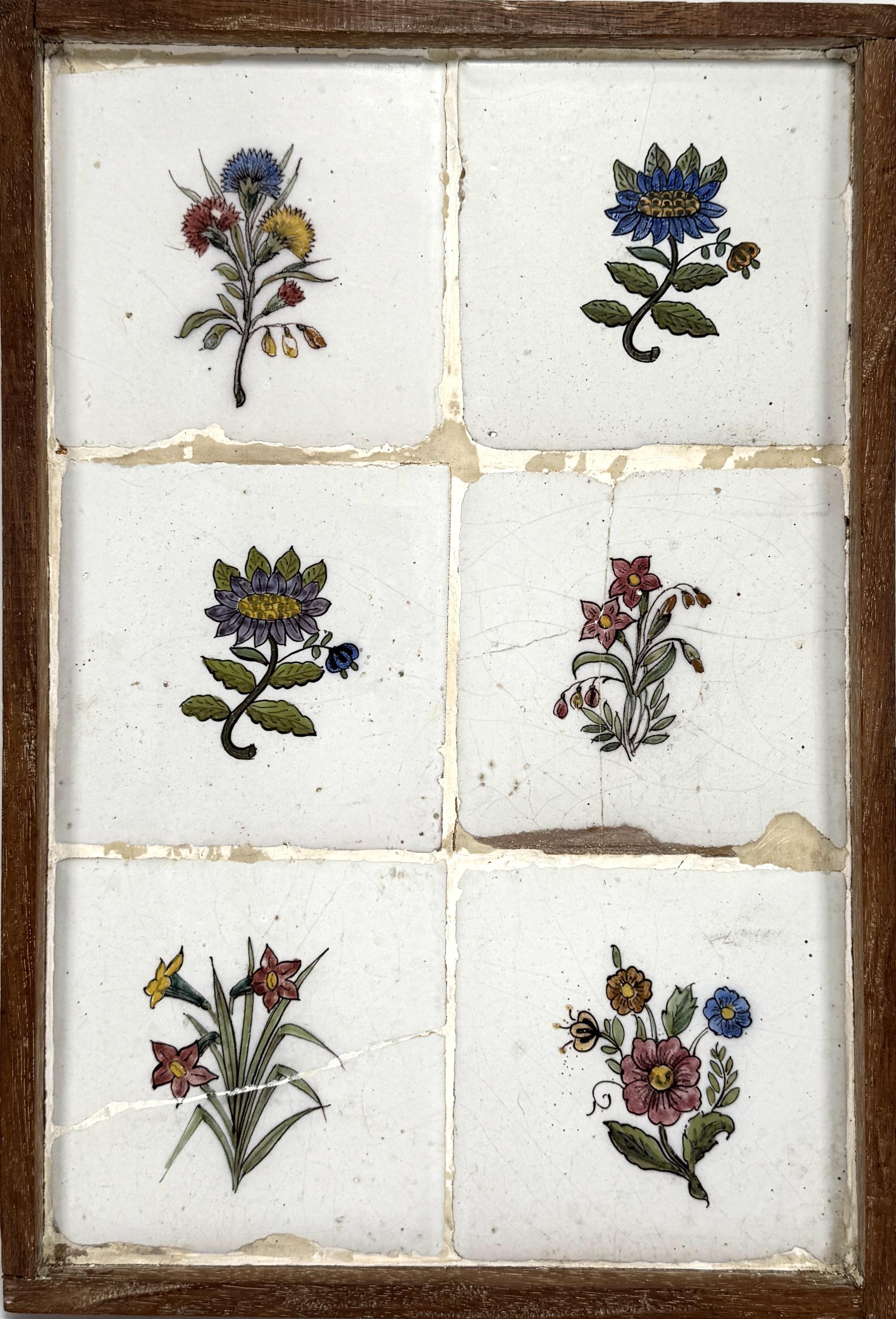 Zes keramieken tegels, laat 18e–begin 19e eeuw, uitgevoerd in aardewerk met tinglazuur en polychroom handbeschilderde bloemmotieven. Elke tegel toont een afzonderlijke florale compositie in naturalistische stijl. De tegels vertonen craquelé en ouderdomssporen en zijn gevat in een houten raamwerk. Kom langs tijdens de kijkdagen (29 t/m 31 augustus) en ontdek deze tegels zelf! |