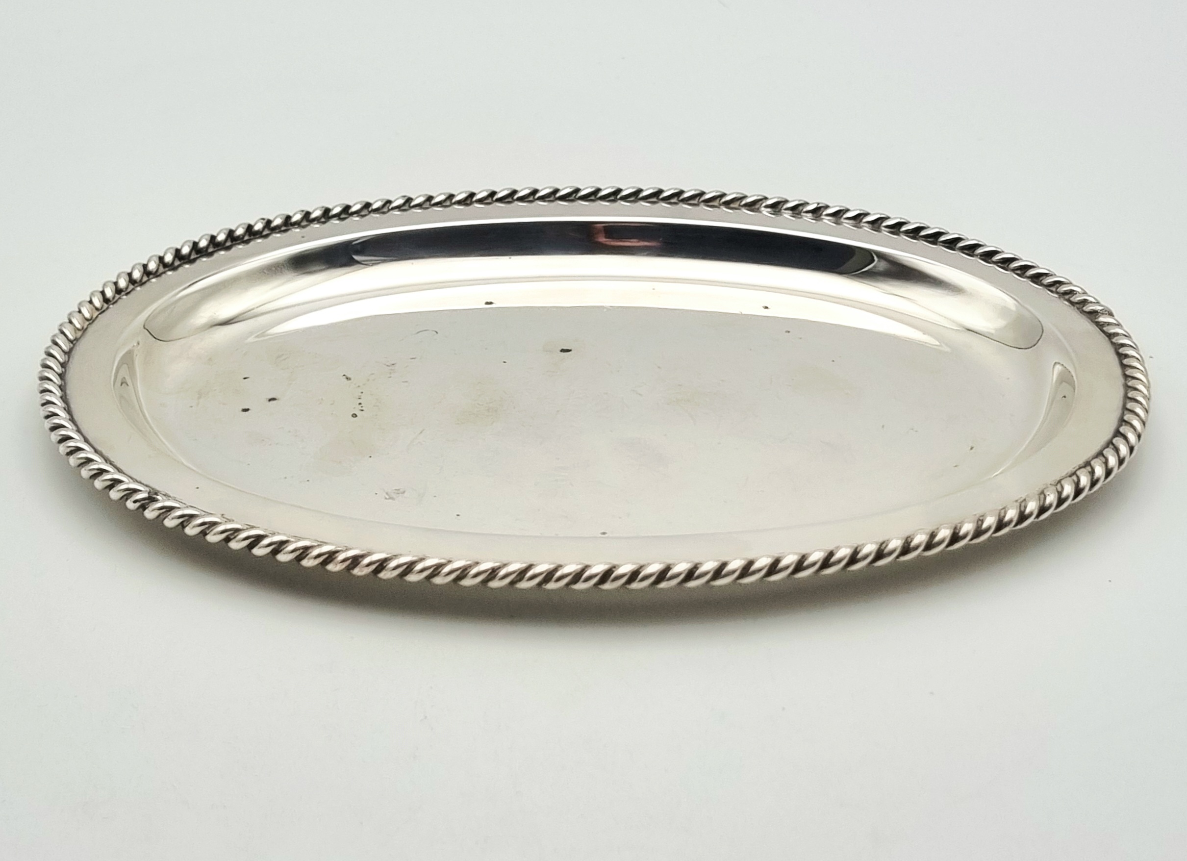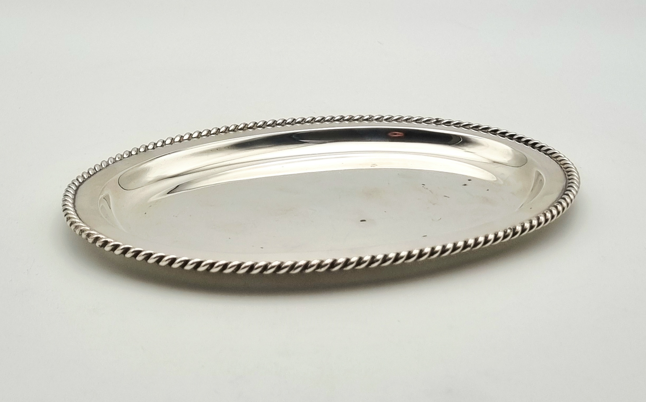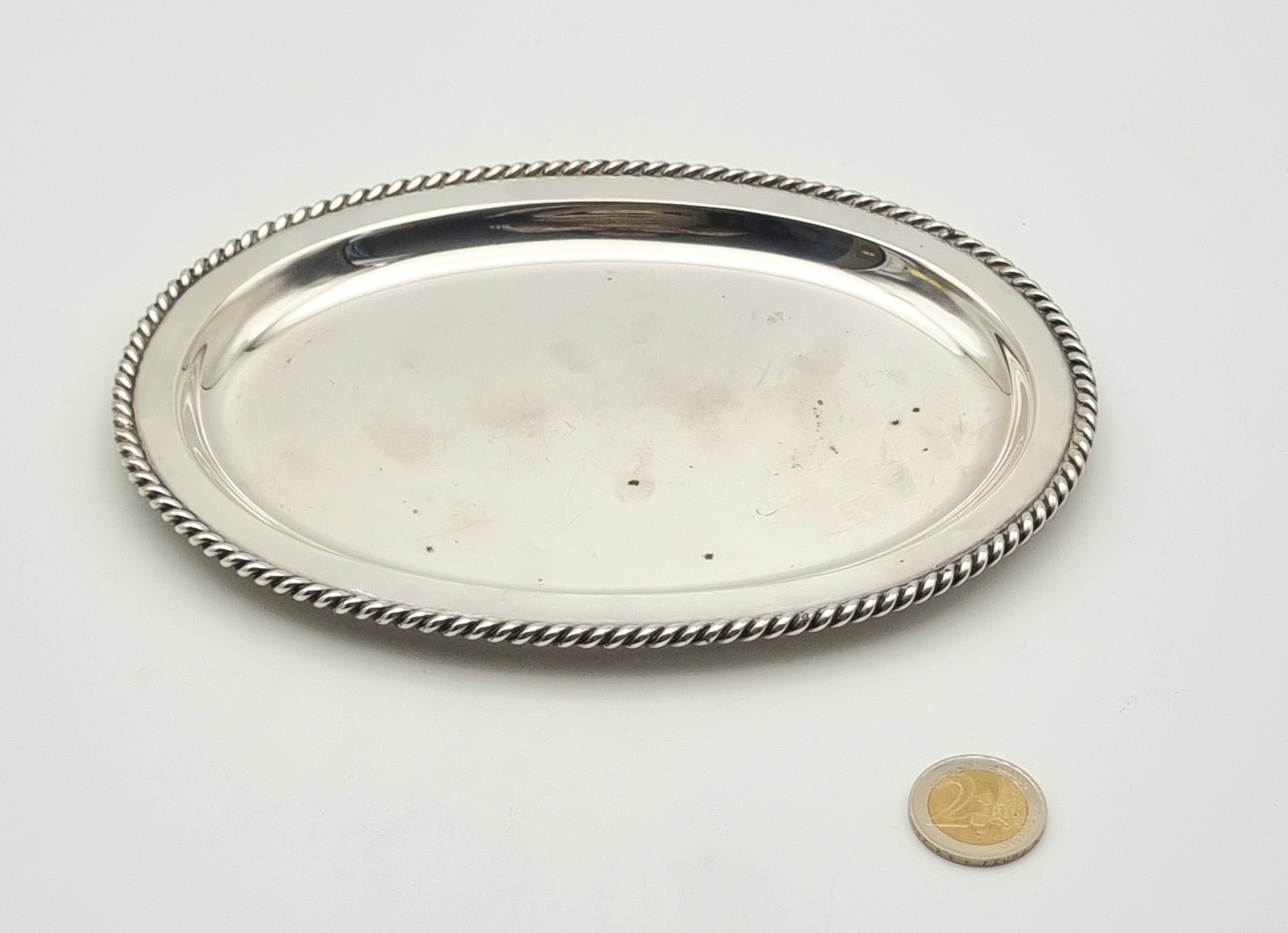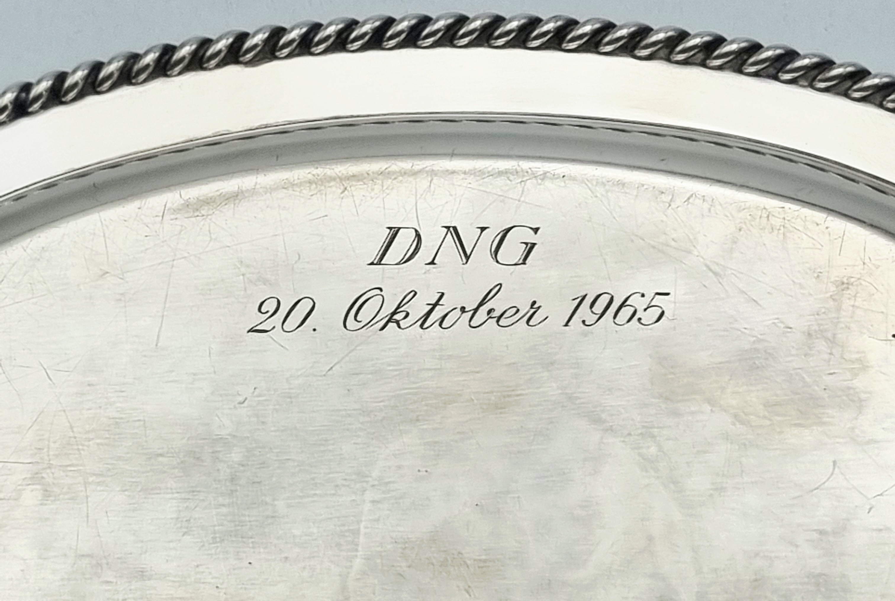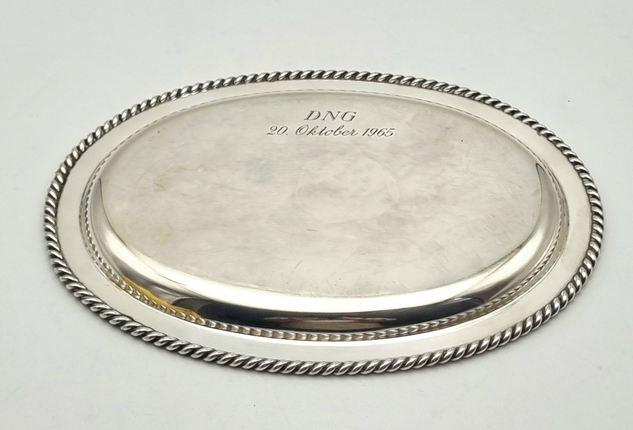 Zilveren dienblaadje in met ovale vorm en geprofileerde koordrand. Vervaardigd uit 835 zilver, onderzijde gemerkt en voorzien van een centraal gegraveerde inscriptie “19-5-1965” met initialen. Klaar om te bieden? Registreer je nu en doe mee aan de veiling! |