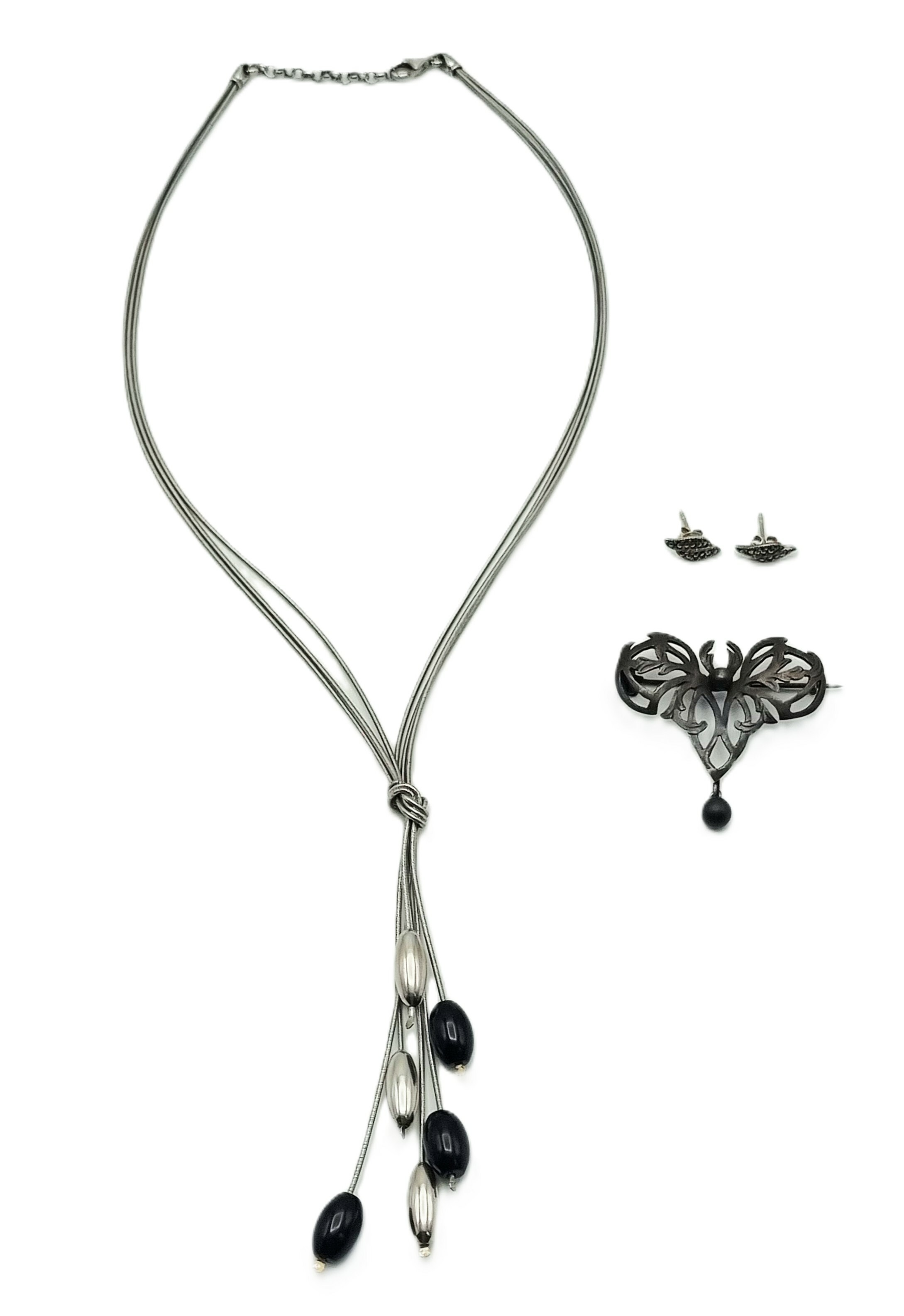 Zilveren sieraden bestaande uit een sterling zilveren ketting met kralen uit de 21e eeuw, een paar oorbellen van sterling zilver, gemerkt 925 . Hierbij een verzilverde broche met organische vormen. Geïnteresseerd? Bezoek onze kijkdagen op 29, 30 of 31 augustus van 11:00 tot 17:00 uur. |
