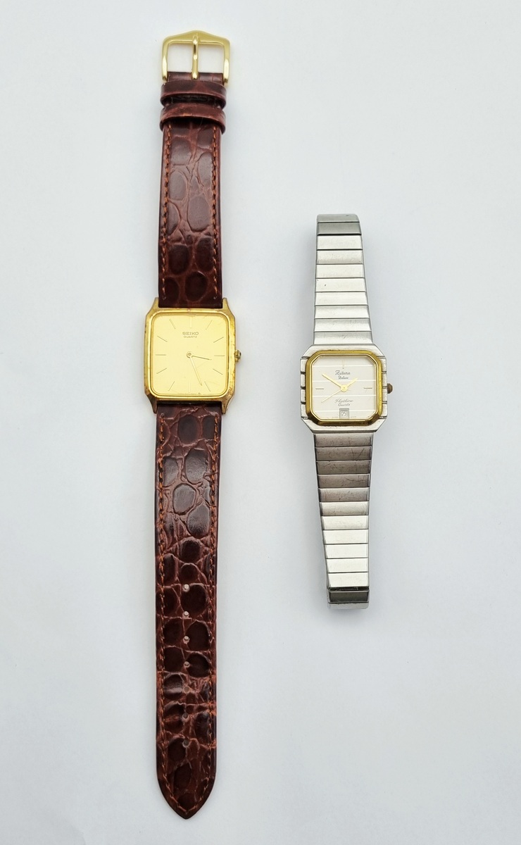 Twee quartz horloges uit de jaren 1980–1990, bestaande uit een Seiko met goudkleurige kast, minimalistische wijzerplaat en lederen krokodillenprint band, en een Zitura Deluxe “Flatline Quartz” met zilver- en goudkleurige kast, datumvenster en metalen armband. De achterzijden zijn gemerkt respectievelijk “Seiko, Japan” en “Swiss Made, Zitura”.