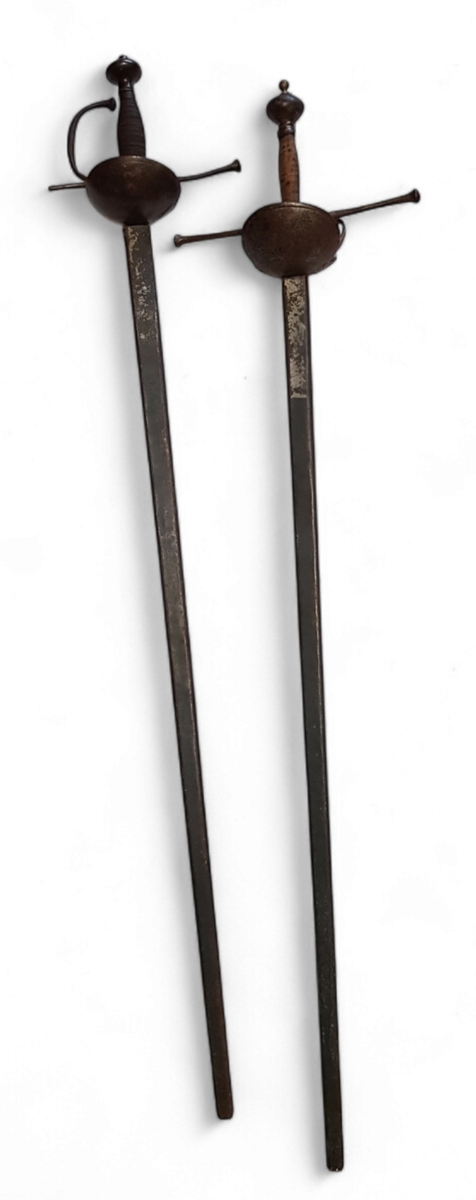 Twee rapiers met leren scheden, begin 17e eeuw, vervaardigd in Saint-Étienne, Frankrijk. De zwaarden zijn van staal en ijzer met houten greep, waarvan één voorzien is van een extra knokkelbeugel. De klingen zijn gesmeed en gehard en onderzijde gemerkt met “ST ETIENNE BALP”. Kenmerkend zijn de lange smalle klingen, komvormige pareerplaten en verlengde quillons.
