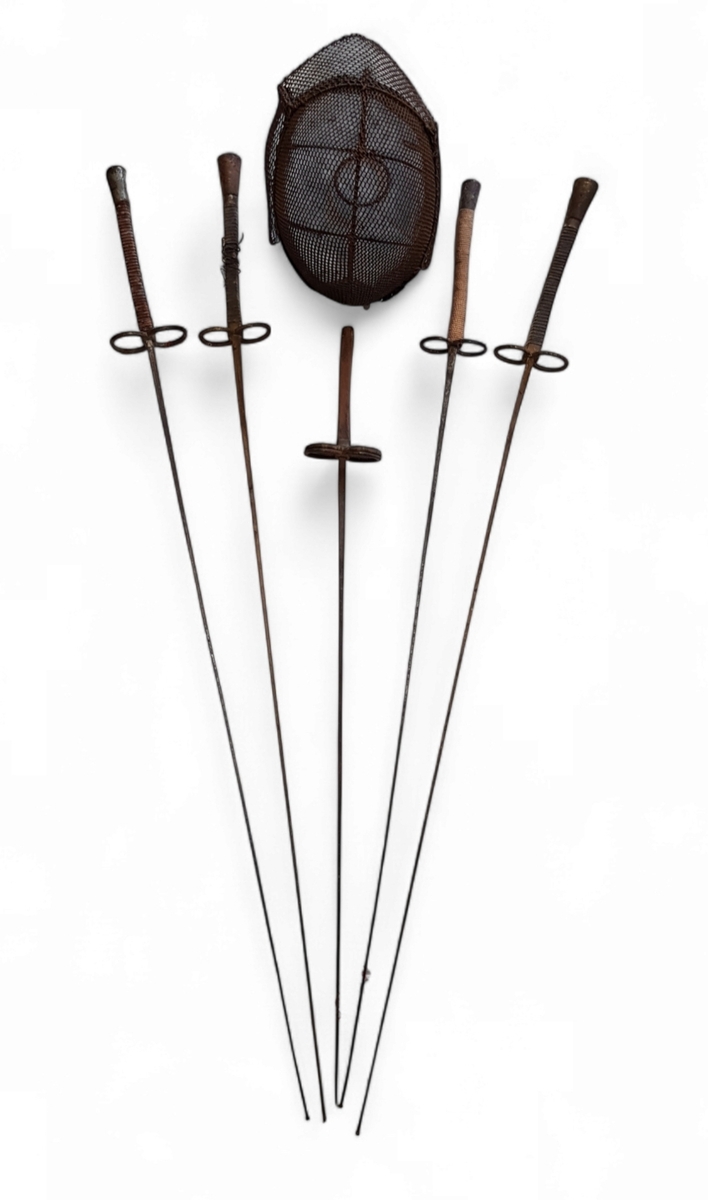 Lot schermattributen bestaande uit vier stalen floretten en een metalen schermmasker, eind 19e eeuw – begin 20e eeuw, Europa. De floretten hebben lange smalle klingen, ronde pareerstangen en houten grepen met wikkeling. Het masker bestaat uit fijnmazig gaas met verstevigde rand en ringconstructie.