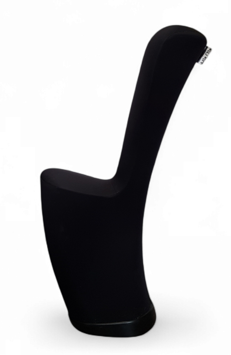 Designstoel "Tip Up", ontwerp C+B Lefebvre en uitgevoerd door Ligne Roset. De stoel is gestoffeerd met polyurethaan schuim op kunststof basis, eind 20e eeuw. De stoel heeft een sculpturale vorm met sterk verlengde rugleuning en vloeiende lijnen, bekleed met zwart textiel. Aanwezig is een zichtbaar label aan de bovenzijde.