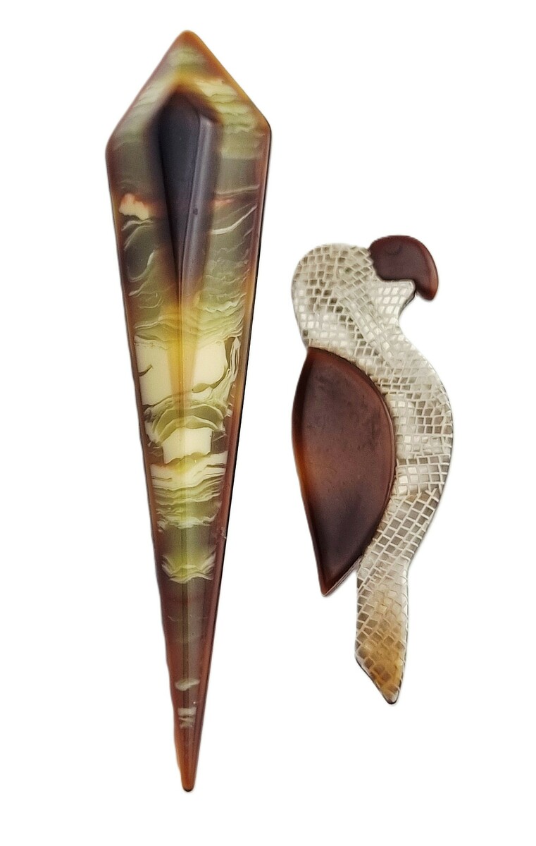 Twee broches van Lea Stein (1936) uit circa 1960. De broches zijn uitgevoerd in een moderne stijl en gemaakt van gelaagd celluloidacetaat, een kunststof. Een broche in de vorm van een papegaai en een broche met een geometrische vorm en abstracte patronen. De objecten zijn aan de achterzijde gesigneerd met 'LEA STEIN PARIS'.
