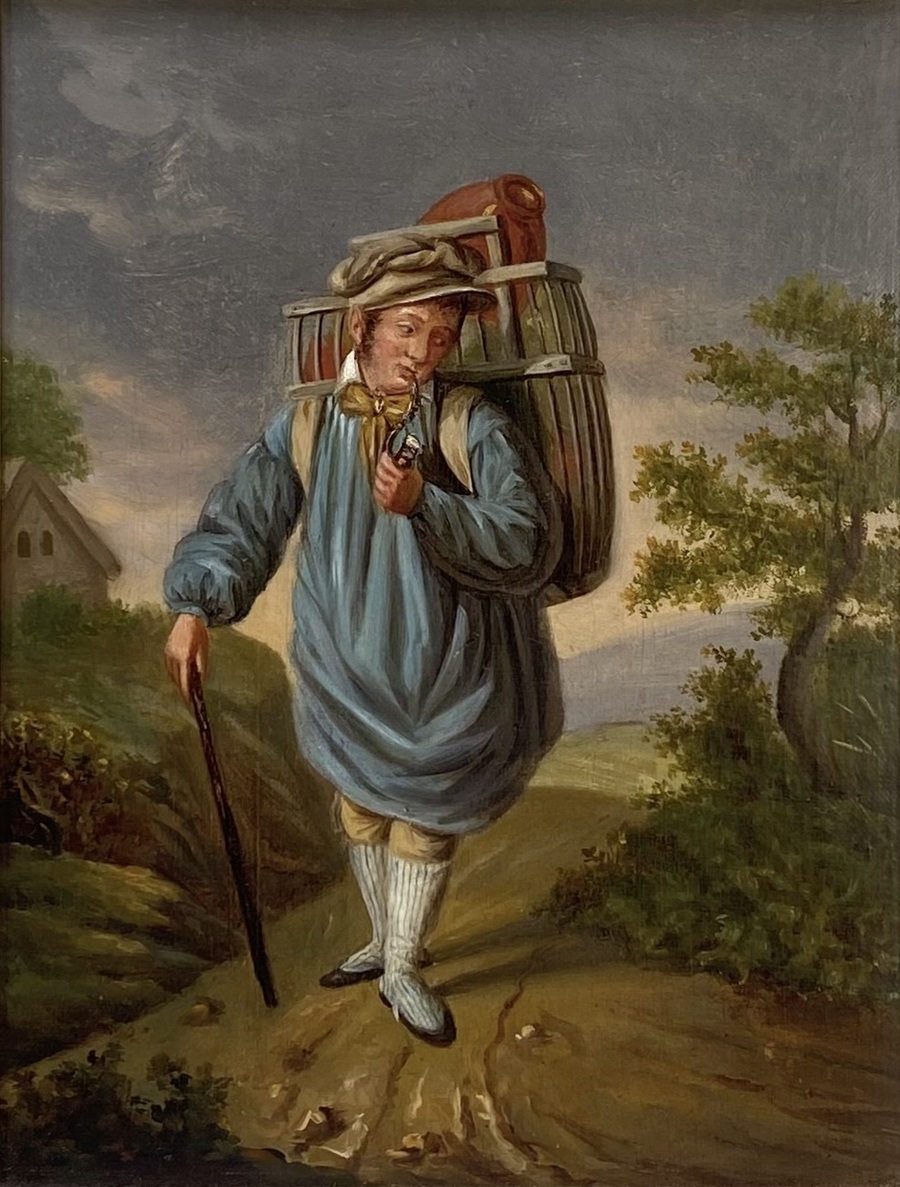 Schilderij op doek in genretraditie, eerste helft 19e eeuw, voorstellend een reiziger op een landweg met wandelstok, groot houten vat en pijp. De reiziger is weergegeven in landelijke omgeving met eenvoudige architectuur en boompartij op de achtergrond. Het werk is uitgevoerd in realistische stijl en geplaatst in een rijk bewerkte goudkleurige lijst met crèmekleurige binnenrand.