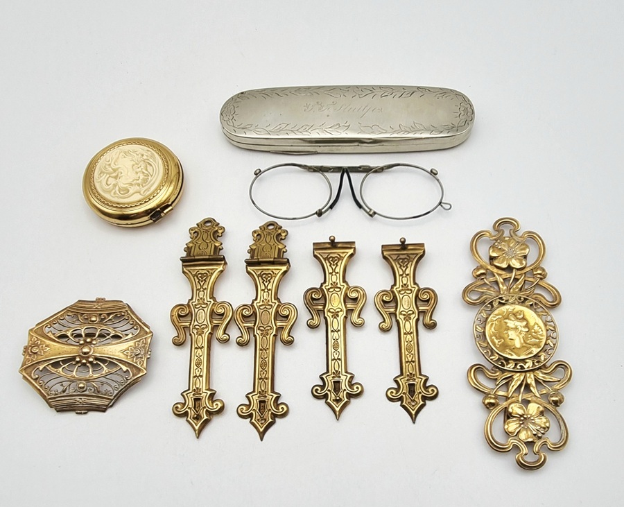 Verzameling curiosa uit de 19e en begin 20e eeuw, bestaande uit diverse messing boekbeslagen, een rond doosje met reliëfdecoratie, een groot sierbeslag met vrouwenbuste en florale motieven, een brillenkoker met gravure en inscriptie en een bril zonder glazen in stalen montuur.