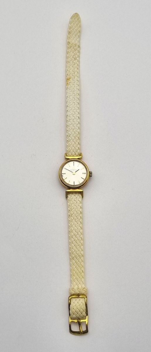 Damespolshorloge van Omega, omstreeks jaren 1960–1970, uitgevoerd met goudkleurige messing kast, witte wijzerplaat met goudkleurige indexstrepen en twee wijzers, voorzien van Omega-logo en merk midden boven. Het horloge heeft een gevlochten textiele band met messing gesp.