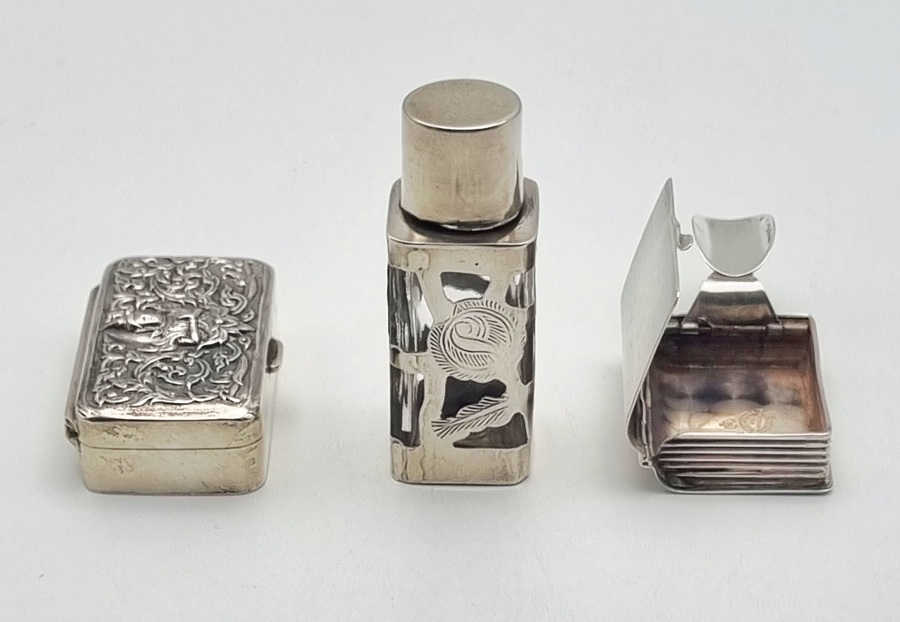 1588. Zilveren doosje, flesje en asbakje, eind 19e-begin 20e eeuw