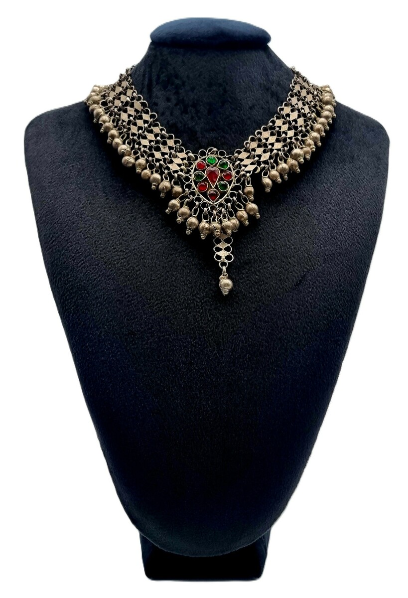 Zilverkleurige halsketting uit de eerste helft van de 20e eeuw. De halsketting is uitgevoerd in een neobarokke stijl en heeft een brede schakel met een hartvormige hanger. De hanger is gedecoreerd met ingezette rode en groene stenen, waaronder een opvallende druppelvormige steen in het midden. Het geheel is afgewerkt met metalen balletjes als versiering.