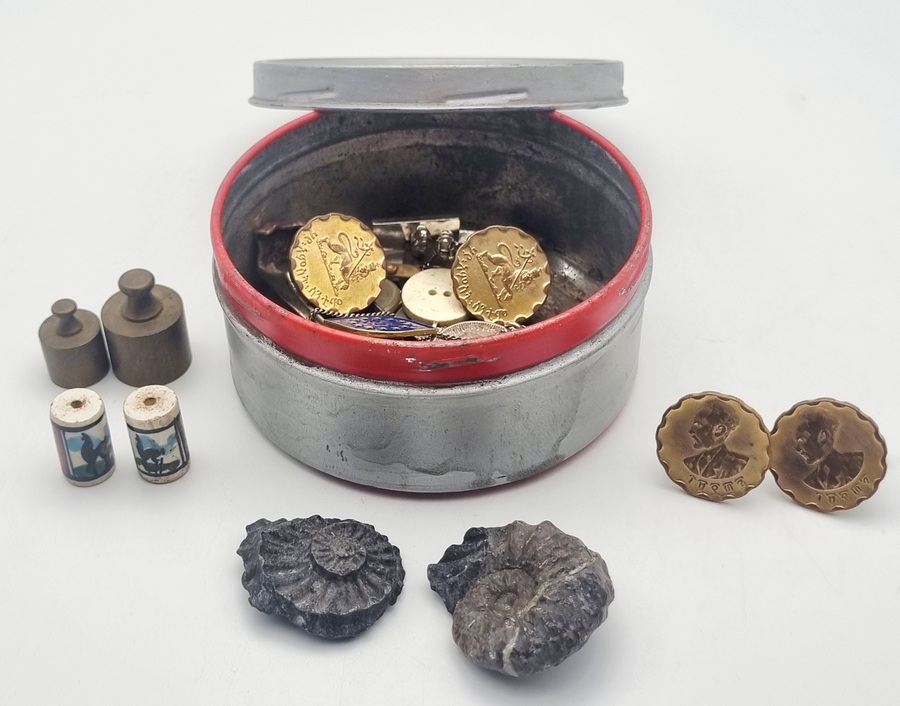 Lot curiosa met onder andere twee manchetknopen met een portret, gewichtjes en twee gefossiliseerde ammonieten, het blikje is gevuld met diverse speldjes, munten en knopen.