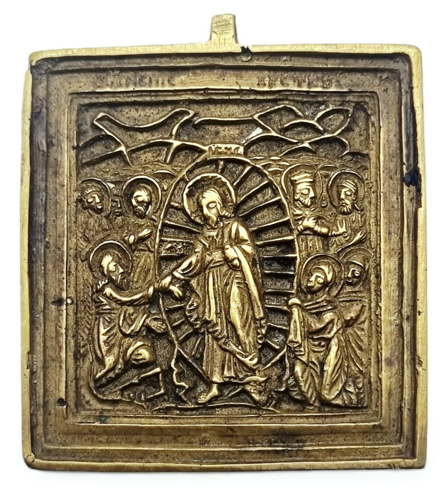 Russisch bronzen reisicoon uit de 18e eeuw, uitgevoerd in gegoten en gegraveerde reliëftechniek. De voorstelling toont Christus centraal omringd door heiligen en engelen met nimbus en voorzien van Cyrillische inscripties aan de bovenzijde. De achterzijde is vlak met gietsporen en bovenaan een klein oogje voor ophanging.