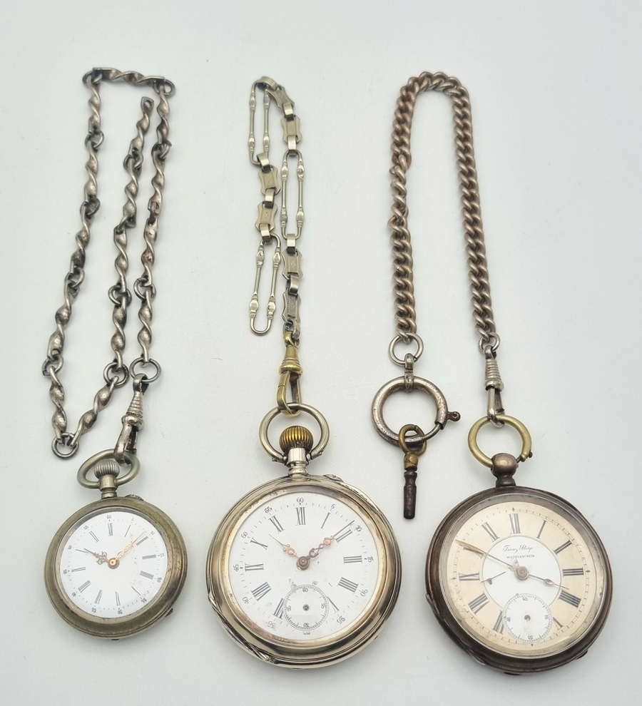 Drie verzilverde zakhorloges met kettingen, eind 19e eeuw tot begin 20e eeuw, waaronder een exemplaar gesigneerd op de wijzerplaat met "Famy Hugu, Winterthur". De wijzerplaten zijn uitgevoerd in emaille met Romeinse cijfers en secondewijzer. Kenmerkend zijn de gegraveerde achterkanten, waaronder een paardmotief en ornamentale medaillonversiering, gecombineerd met verschillende kettingvormen.