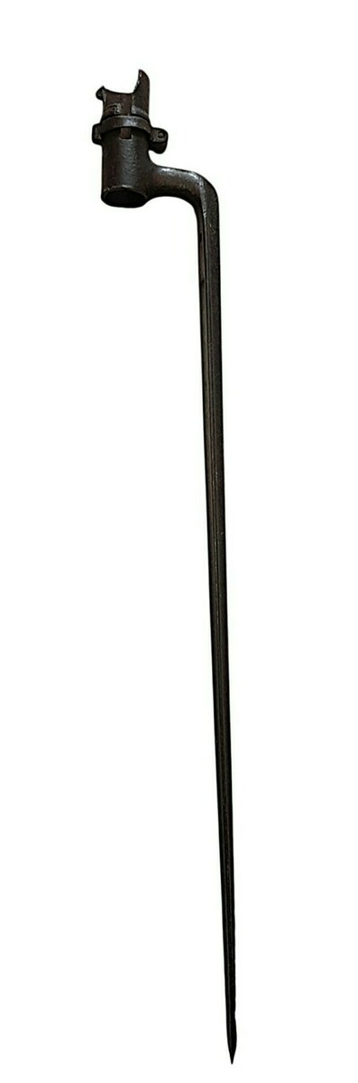 Een bajonet met een bijbehorende schede uit circa het einde van de 19e eeuw, vervaardigd van ijzer, met een handgreep en een getorste pareerstang. De stijl is militaristisch, met een focus op functionaliteit. De bajonet en schede zijn vervaardigd door middel van smeden en metaalbewerking en zijn kenmerkend voor de militaire productie van die periode.
