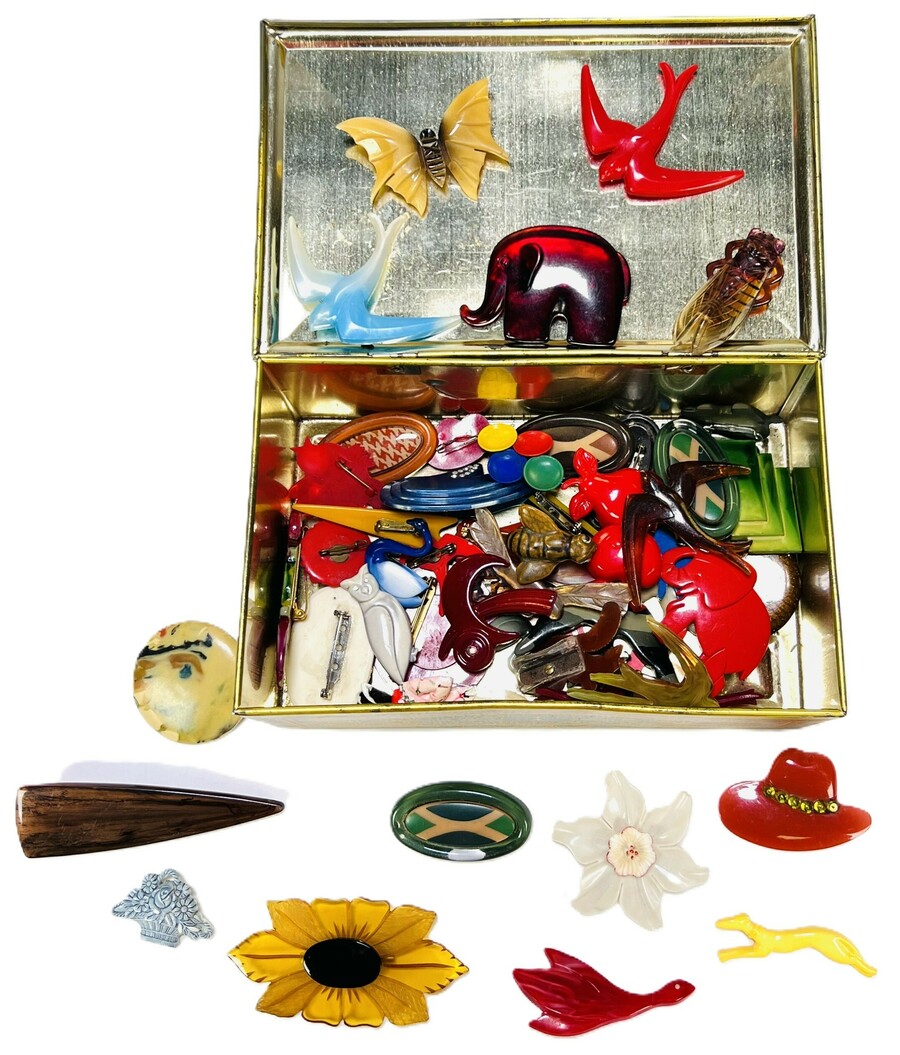 Collectie kunststof broches uit de tweede helft van de 20e eeuw, uitgevoerd in verschillende stijlen, waaronder neoclassicisme en Art Nouveau. De collectie bestaat uit een groot aantal broches van diverse kunststoffen, zoals celluloidacetaat en zijn opgeborgen in een blik met een meerkleurig decoratief motief.