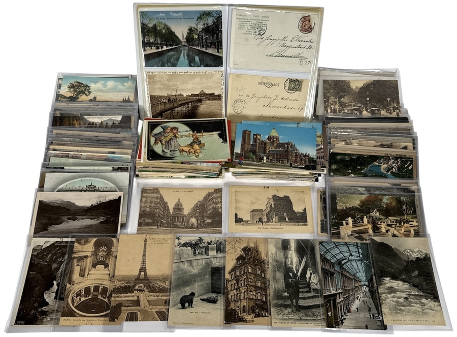 Verzameling oude ansichtkaarten, begin 20e eeuw tot midden 20e eeuw, gedrukt in collotypie, lithografie en offsetdruk, deels handgekleurd. Te zien zijn stadsgezichten, landschappen en architectuur, waaronder Parijs en Amsterdam. Een deel van de kaarten is voorzien van postzegels, poststempels en persoonlijke correspondentie.
