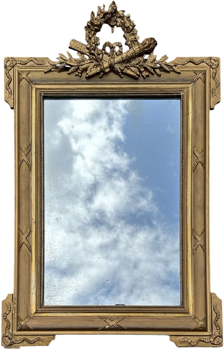 Louis XVI spiegel, 19e eeuw, uitgevoerd in hout met goudkleurige lijst en vlak spiegelglas. Kenmerkend zijn de rechte profilering met kruismotieven, strik- en lauwerdecoraties en de trofeeënbekroning. De achterzijde toont stencilmotieven met nummers en een oud ijzerdraad ophangsysteem.