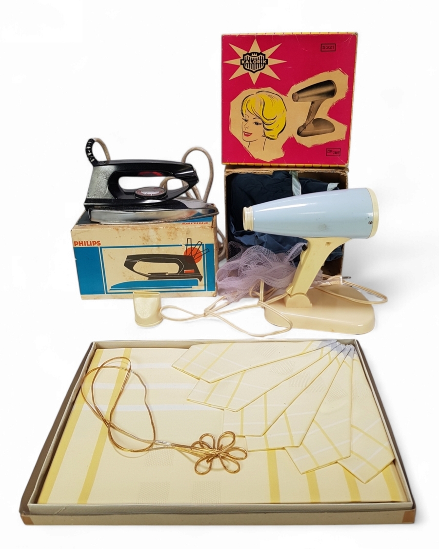 Een Philips strijkijzer en een Kalorik föhn, beide in originele verpakking, evenals een set decoratieve tafelaccessoires in doos. De objecten dateren uit het midden 20e eeuw en zijn vervaardigd uit metaal, kunststof, textiel en karton. Kenmerkend zijn de originele grafische verpakkingen en de functionele vormgeving, typerend voor naoorlogse gebruiksvoorwerpen.
