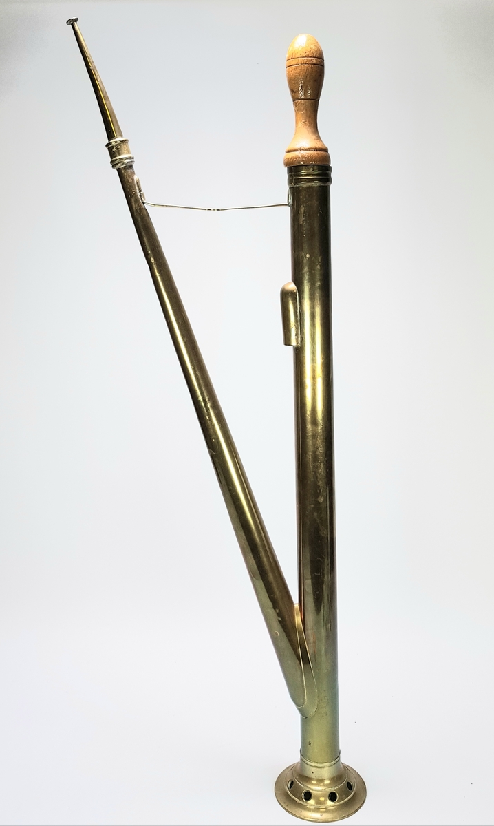 Messing raamspuit met houten knop, eind 19e eeuw – begin 20e eeuw. De raamspuit bestaat uit een cilindervormige buis met geperforeerde voet en een gebogen zijpijp met smalle spuitmond, verbonden door een dunne draad. De houten knop is gedraaid en functioneert als handgreep. Dit gebruiksvoorwerp diende voor het besproeien van ramen of planten en is uitgevoerd in utilitaire stijl.