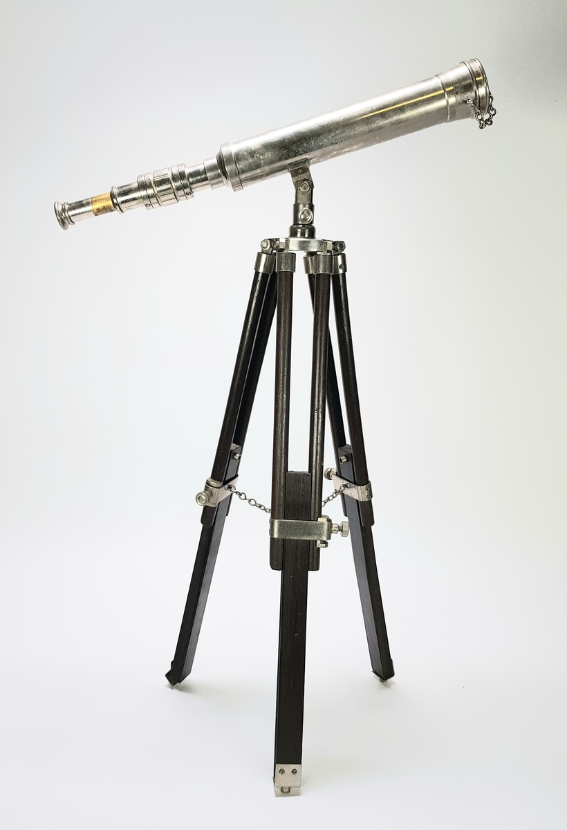 Telescoop op statief midden 20e eeuw. De kijker is gemaakt van verchroomd metaal met gekartelde randen en uitschuifbare delen. Het statief bestaat uit drie donkerhouten poten die met metalen elementen aan elkaar verbonden zijn.