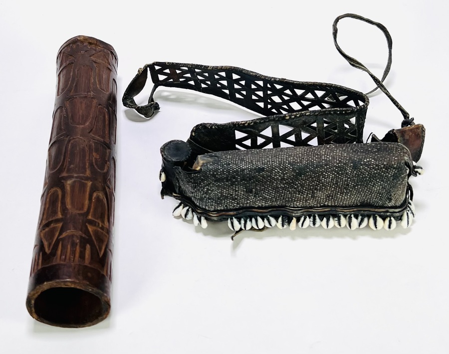 Afrikaanse waarzeggersgordel en cilindervormige koker, 20e eeuw, Centraal-Afrika, vervaardigd uit hout, leer, huid en kauri-schelpen. De gordel toont opengewerkte vlechttechniek met schelpen en bevat cilindrische inzetstukken van hout of bamboe, gebruikt in divinatiepraktijken. De houten cilinder is rondom voorzien van geometrische patronen en diende als pijpkoker of magisch attribuut. Beide objecten vertegenwoordigen rituele en symbolische toepassingen.