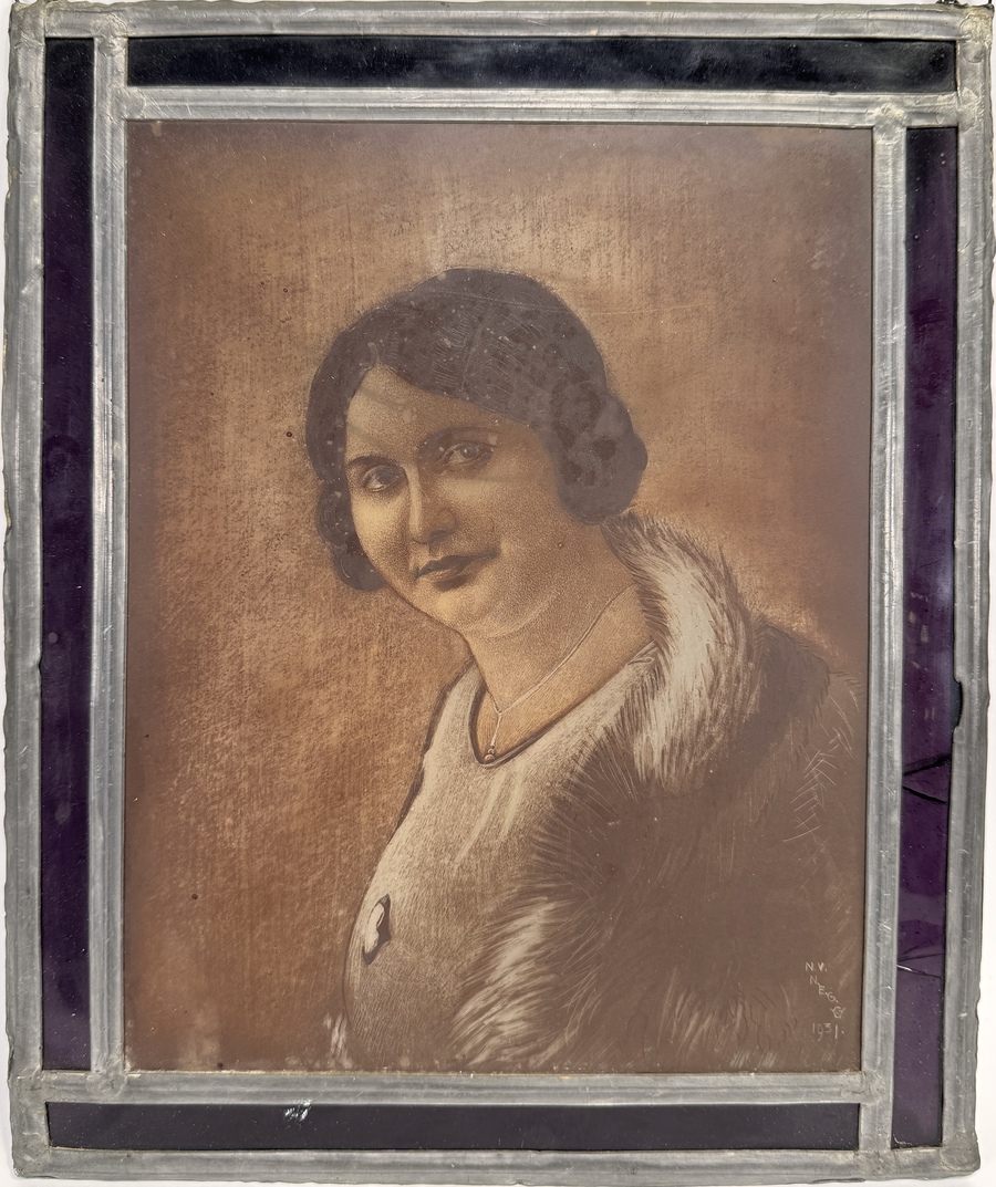 Glas-in-lood portret van een vrouw, vervaardigd in Art Deco periode en rechtsonder gesigneerd en gedateerd "N.V. Neg. 1931". Het werk toont een in profiel geplaatste vrouw met bontkraag en collier, uitgevoerd in fotografische techniek met handmatige inkleuring op glas. De omlijsting bestaat uit geometrisch geplaatst paars en zwart glas, gevat in lood.