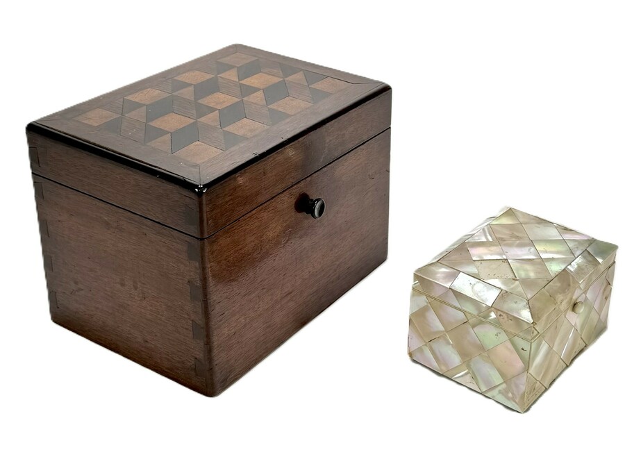Twee doosjes uit de tweede helft van de 19e eeuw. Een doosje is vervaardigd van mahoniehout, gedecoreerd met een geometrische houtinleg op de deksel. Het tweede, kleinere doosje is volledig bekleed met parelmoer in een ruitpatroon. Beide objecten zijn kenmerkend voor de Victoriaanse periode, door het gebruik van decoratieve materialen.