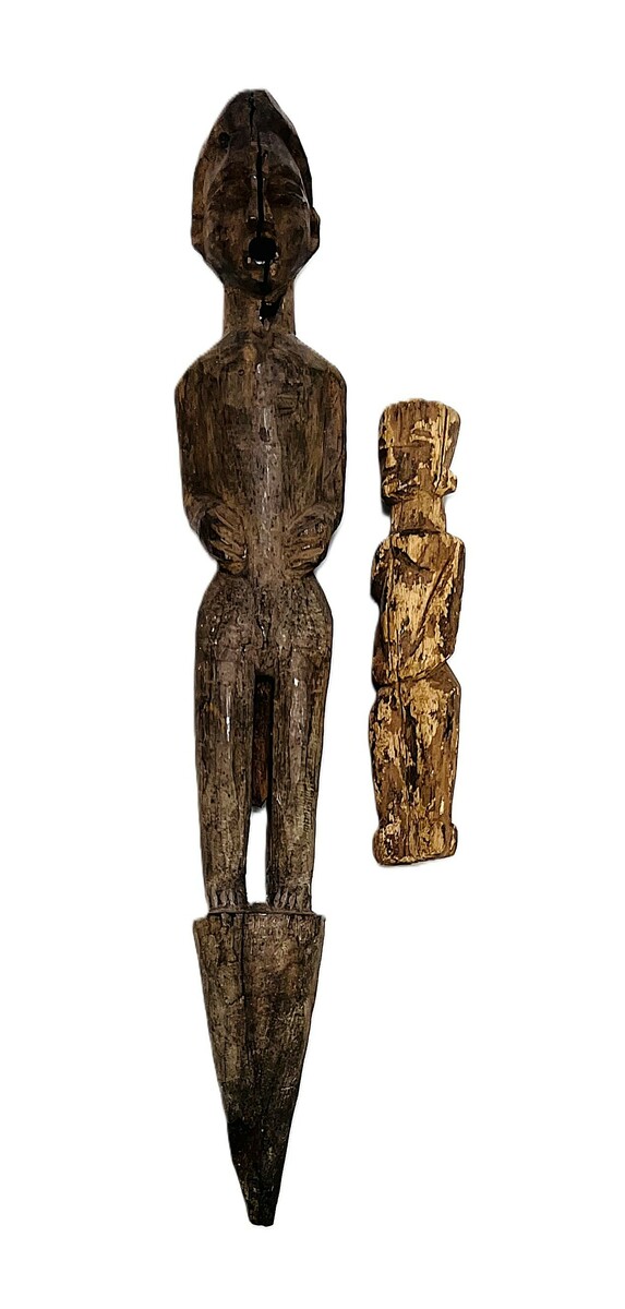 Twee houten beeldjes in traditionele Fon-stijl, eind 19e tot begin 20e eeuw, afkomstig uit Togo/Dahomey. Het grotere beeld toont een gestileerde vrouwelijke figuur met open mond en puntige basis, bedoeld voor plaatsing in de grond of een altaar. Het kleinere beeld heeft een blokvormig hoofd en armen tegen de borst, sober uitgevoerd. Handgesneden in hout met duidelijke sporen van ritueel gebruik en veroudering.