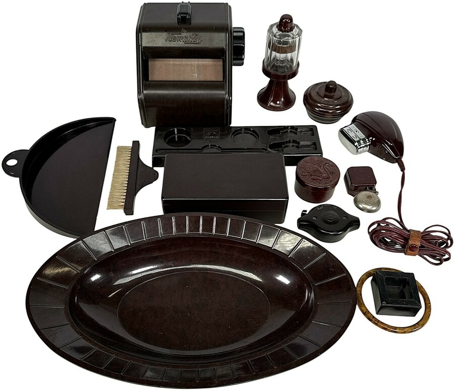 Collectie bakeliet uit circa 1950 bestaat uit onder andere een ovale schaal en diverse doosjes, vervaardigd in de stijl van het functionalisme, kenmerkend door strakke lijnen. Deze accessoires werden geproduceerd via spuitgiet- en perstechnieken, wat gebruikelijk was voor bakelieten objecten uit die tijd.