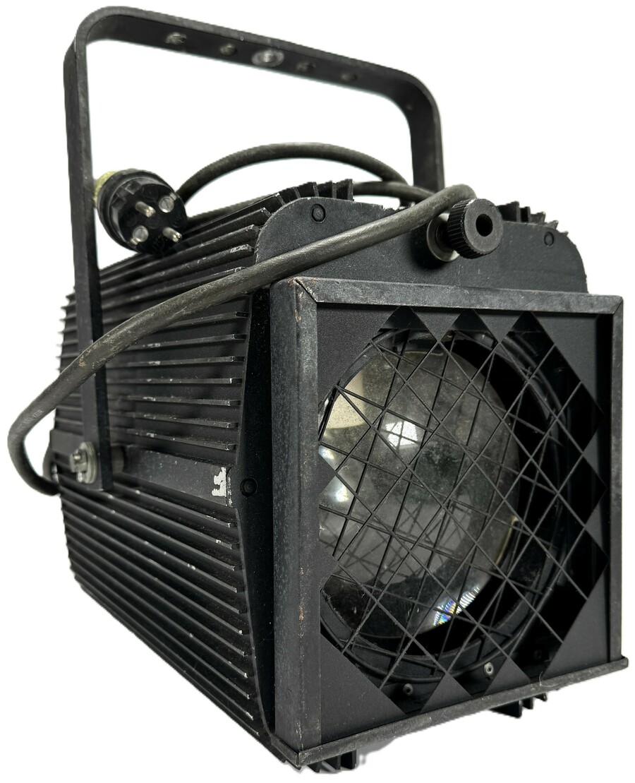 Studiolamp ADB, type THH 1001 JHC, tweede helft 20e eeuw, uitgevoerd in zwart gecoat metaal met glaslens en beschermrooster. Het typeplaatje vermeldt 220V, 4.5A, 1kW vermogen en serienummer 100516030. Kenmerkend zijn de koelribben, het beschermrooster en de verstelbare montagebeugel. De lamp is ontworpen voor professioneel gebruik in theater- en filmproducties.