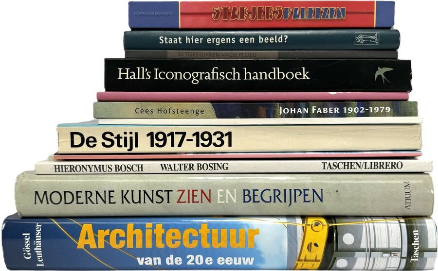 Collectie van dertien boeken over kunst en architectuur uit het midden tot einde van de 20e eeuw. De boeken behandelen onderwerpen als de Amsterdamse school, De Stijl en de architectuur van de vorige eeuw. De collectie bevat boeken met hardcover en paperback kaften, met daarin foto's en offsetdrukken van diverse kunstwerken.