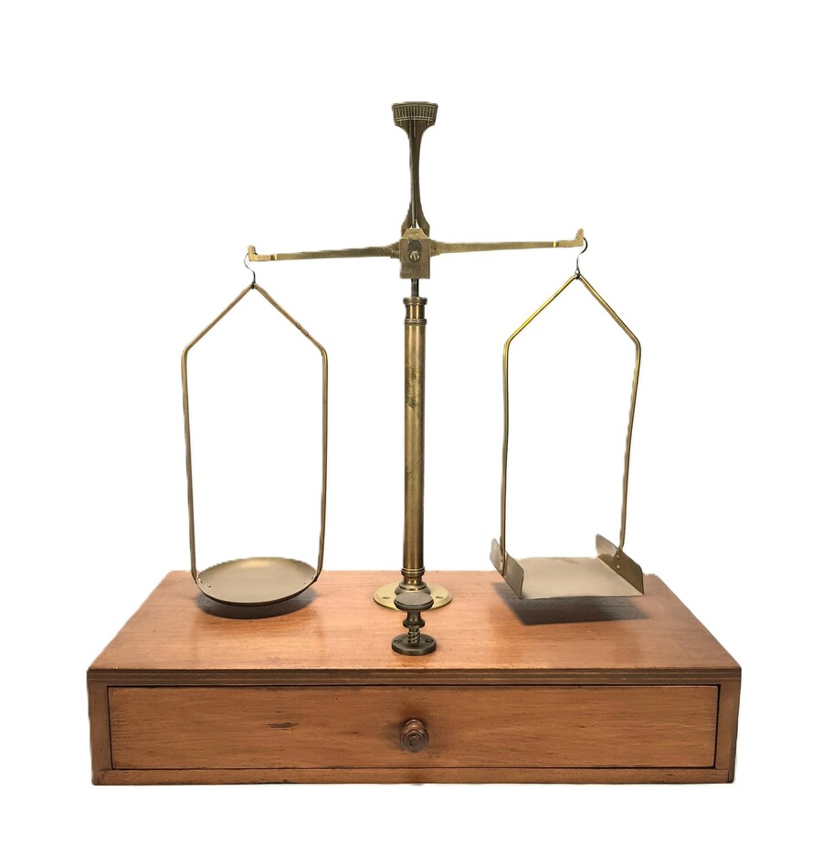Balans, begin 20e eeuw, vervaardigd in een functionele stijl. Het object is gemaakt van messing en heeft een houten voetstuk met een lade voor het opbergen van de gewichtjes. De lade bevat verschillende gewichtjes, waaronder enkele van koper. De weegschaal heeft een verticale schaalverdeling en twee schalen aan de uiteinden van een dwarsbalk.