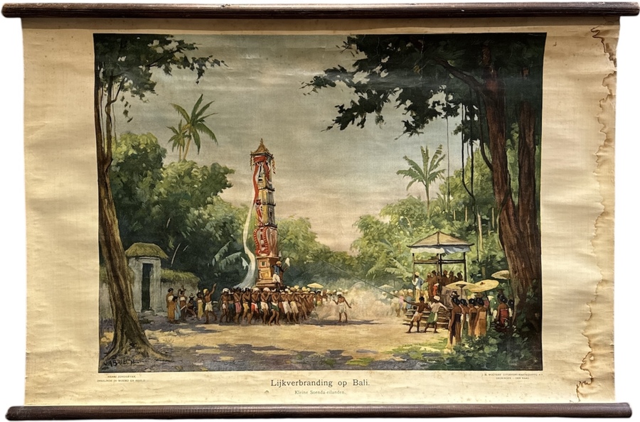 Schoolkaart met voorstelling van een Balinese lijkverbranding, vervaardigd in de eerste helft van de 20e eeuw door Johan Gabriëlse (1881–1945). De chromolithografie op linnen toont een kleurrijk ritueel met centrale toren, dragers en toeschouwers in tropische omgeving. Uitgegeven door J.B. Wolters Uitgevers-Maatschappij N.V., Groningen en Batavia, voorzien van houten rolstokken en ondertitel "Lijkverbranding op Bali".