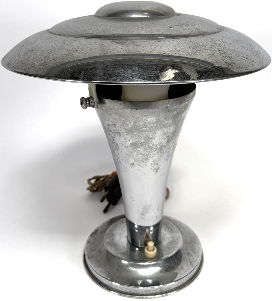 Art Deco tafellamp uit de jaren 1930, uitgevoerd in metaal met verchroomde afwerking. De lamp heeft een karakteristieke mushroom kap, een kelkvormige stam en een ronde voet met geïntegreerde schakelaar. Kenmerkend zijn de strakke geometrische lijnen en het glanzende oppervlak.