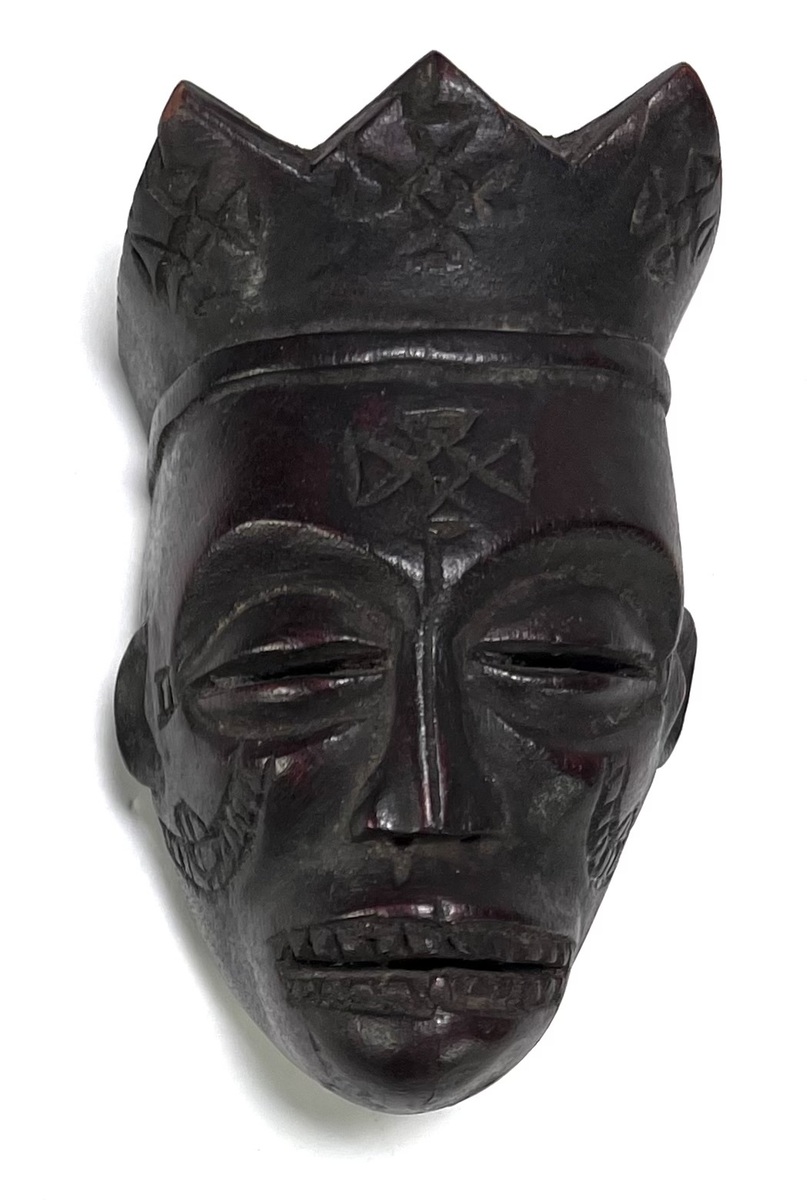 Afrikaans houten masker, midden 20e eeuw, toegeschreven aan de Edo/Benin cultuur in Nigeria. Het object is handgesneden en hol uitgewerkt met bevestigingsgaten, uitgevoerd met een driepuntige kroonvorm, horizontale oogspleten, ingesneden tanden en littekenmarkeringen op de wangen.